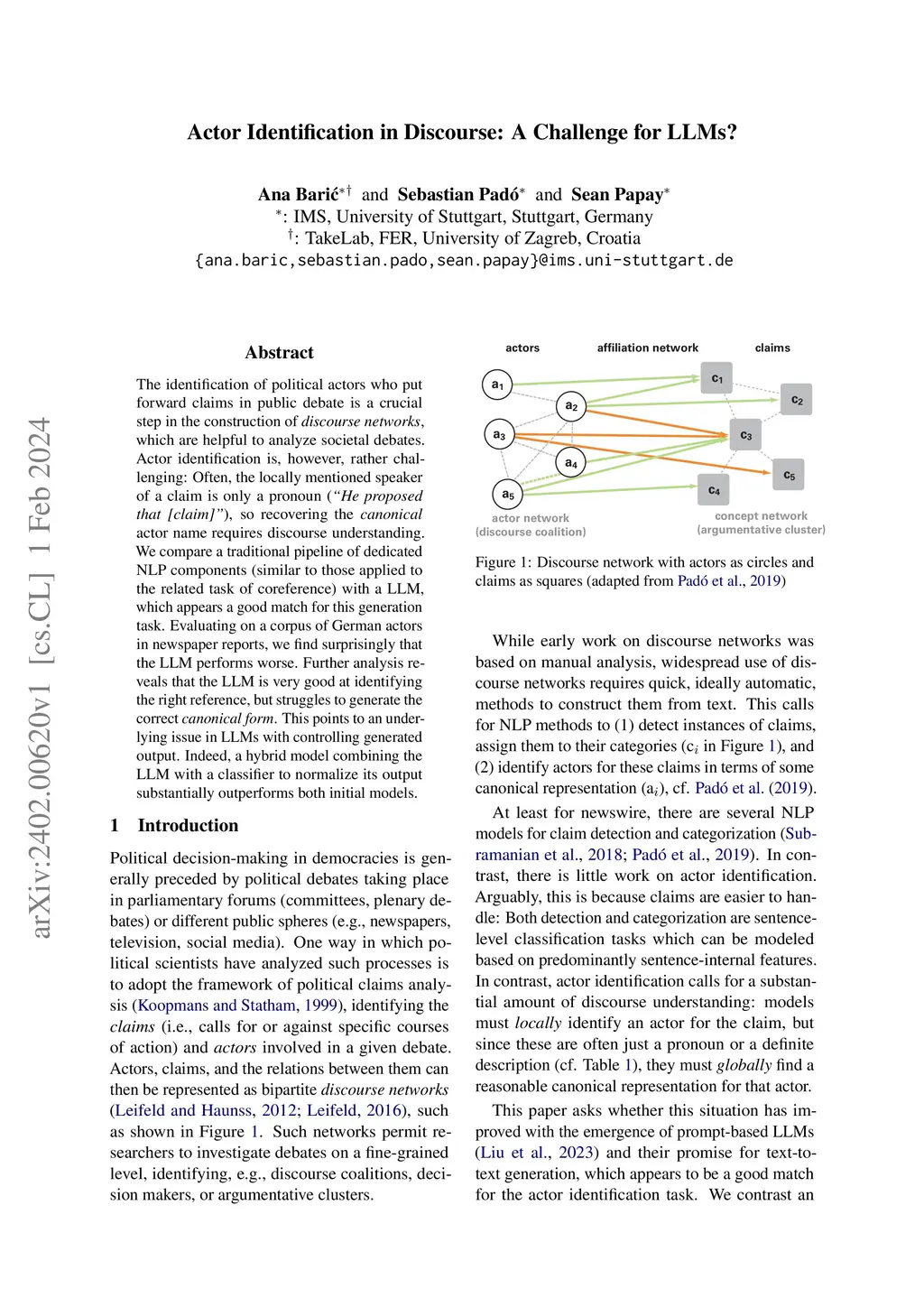 The identification of political actors who put forward claims in public debate is a crucial step in the construction of discourse networks, which are helpful to analyze societal debates. Actor identification is, however, rather challenging: Often, the locally mentioned speaker of a claim is only a pronoun ("He proposed that [claim]"), so recovering the canonical actor name requires discourse understanding. We compare a traditional pipeline of dedicated NLP components (similar to those applied to the related task of coreference) with a LLM, which appears a good match for this generation task. Evaluating on a corpus of German actors in newspaper reports, we find surprisingly that the LLM performs worse. Further analysis reveals that the LLM is very good at identifying the right reference, but struggles to generate the correct canonical form. This points to an underlying issue in LLMs with controlling generated output. Indeed, a hybrid model combining the LLM with a classifier to normalize its output substantially outperforms both initial models.
