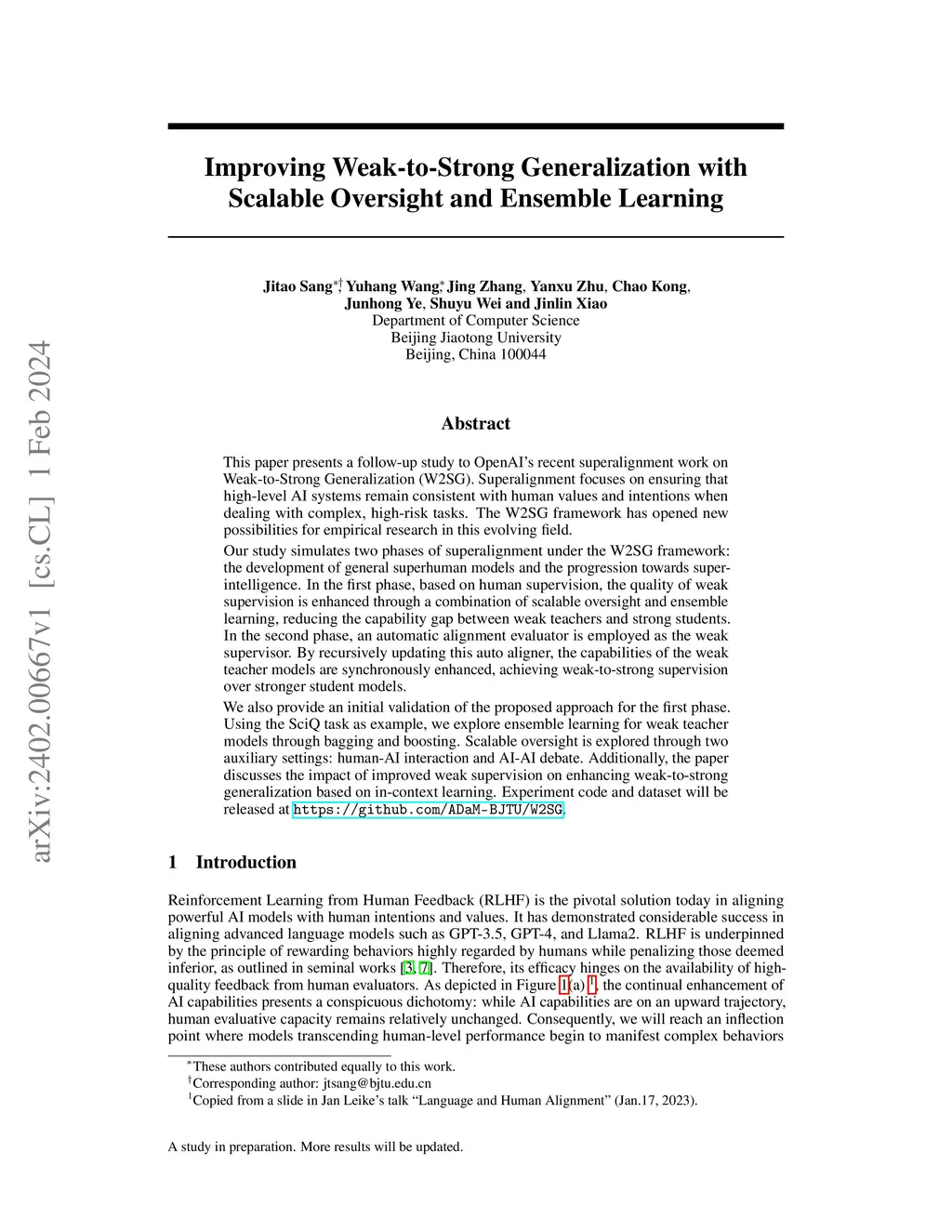 This paper presents a follow-up study to OpenAI's recent superalignment work on Weak-to-Strong Generalization (W2SG). Superalignment focuses on ensuring that high-level AI systems remain consistent with human values and intentions when dealing with complex, high-risk tasks. The W2SG framework has opened new possibilities for empirical research in this evolving field. Our study simulates two phases of superalignment under the W2SG framework: the development of general superhuman models and the progression towards superintelligence. In the first phase, based on human supervision, the quality of weak supervision is enhanced through a combination of scalable oversight and ensemble learning, reducing the capability gap between weak teachers and strong students. In the second phase, an automatic alignment evaluator is employed as the weak supervisor. By recursively updating this auto aligner, the capabilities of the weak teacher models are synchronously enhanced, achieving weak-to-strong supervision over stronger student models.We also provide an initial validation of the proposed approach for the first phase. Using the SciQ task as example, we explore ensemble learning for weak teacher models through bagging and boosting. Scalable oversight is explored through two auxiliary settings: human-AI interaction and AI-AI debate. Additionally, the paper discusses the impact of improved weak supervision on enhancing weak-to-strong generalization based on in-context learning. Experiment code and dataset will be released at https://github.com/ADaM-BJTU/W2SG.