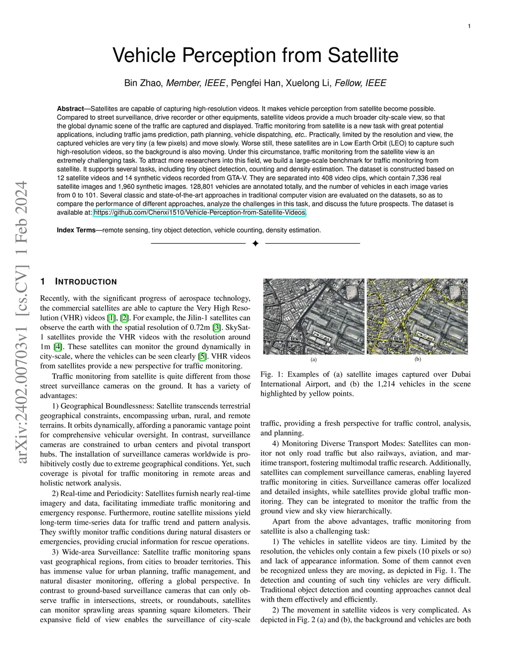 Satellites are capable of capturing high-resolution videos. It makes vehicle perception from satellite become possible. Compared to street surveillance, drive recorder or other equipments, satellite videos provide a much broader city-scale view, so that the global dynamic scene of the traffic are captured and displayed. Traffic monitoring from satellite is a new task with great potential applications, including traffic jams prediction, path planning, vehicle dispatching, \emph{etc.}. Practically, limited by the resolution and view, the captured vehicles are very tiny (a few pixels) and move slowly. Worse still, these satellites are in Low Earth Orbit (LEO) to capture such high-resolution videos, so the background is also moving. Under this circumstance, traffic monitoring from the satellite view is an extremely challenging task. To attract more researchers into this field, we build a large-scale benchmark for traffic monitoring from satellite. It supports several tasks, including tiny object detection, counting and density estimation. The dataset is constructed based on 12 satellite videos and 14 synthetic videos recorded from GTA-V. They are separated into 408 video clips, which contain 7,336 real satellite images and 1,960 synthetic images. 128,801 vehicles are annotated totally, and the number of vehicles in each image varies from 0 to 101. Several classic and state-of-the-art approaches in traditional computer vision are evaluated on the datasets, so as to compare the performance of different approaches, analyze the challenges in this task, and discuss the future prospects. The dataset is available at: https://github.com/Chenxi1510/Vehicle-Perception-from-Satellite-Videos.