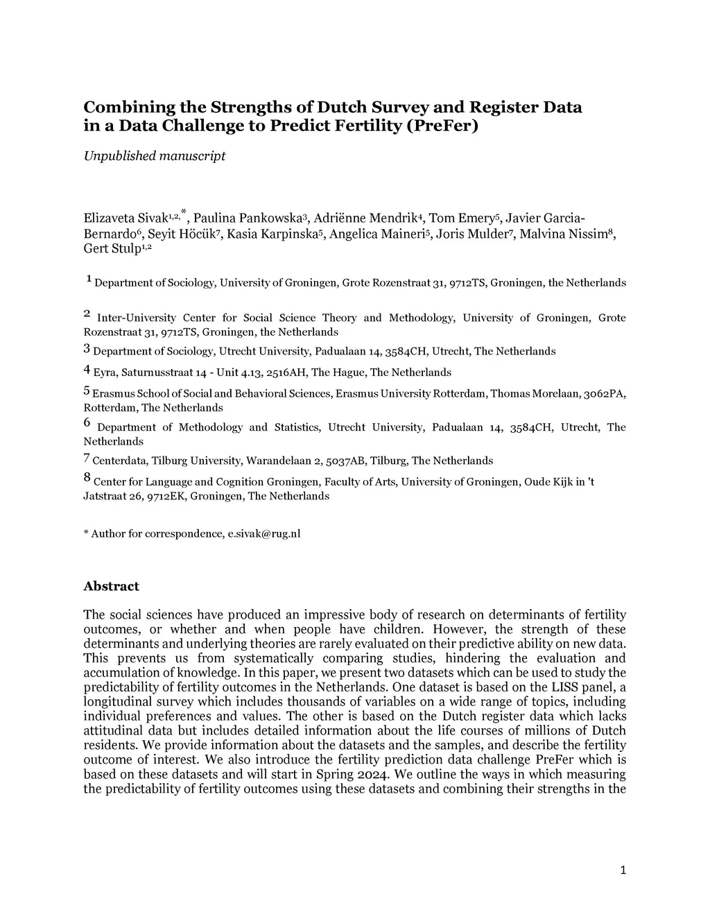 The social sciences have produced an impressive body of research on determinants of fertility outcomes, or whether and when people have children. However, the strength of these determinants and underlying theories are rarely evaluated on their predictive ability on new data. This prevents us from systematically comparing studies, hindering the evaluation and accumulation of knowledge. In this paper, we present two datasets which can be used to study the predictability of fertility outcomes in the Netherlands. One dataset is based on the LISS panel, a longitudinal survey which includes thousands of variables on a wide range of topics, including individual preferences and values. The other is based on the Dutch register data which lacks attitudinal data but includes detailed information about the life courses of millions of Dutch residents. We provide information about the datasets and the samples, and describe the fertility outcome of interest. We also introduce the fertility prediction data challenge PreFer which is based on these datasets and will start in Spring 2024. We outline the ways in which measuring the predictability of fertility outcomes using these datasets and combining their strengths in the data challenge can advance our understanding of fertility behaviour and computational social science. We further provide details for participants on how to take part in the data challenge.