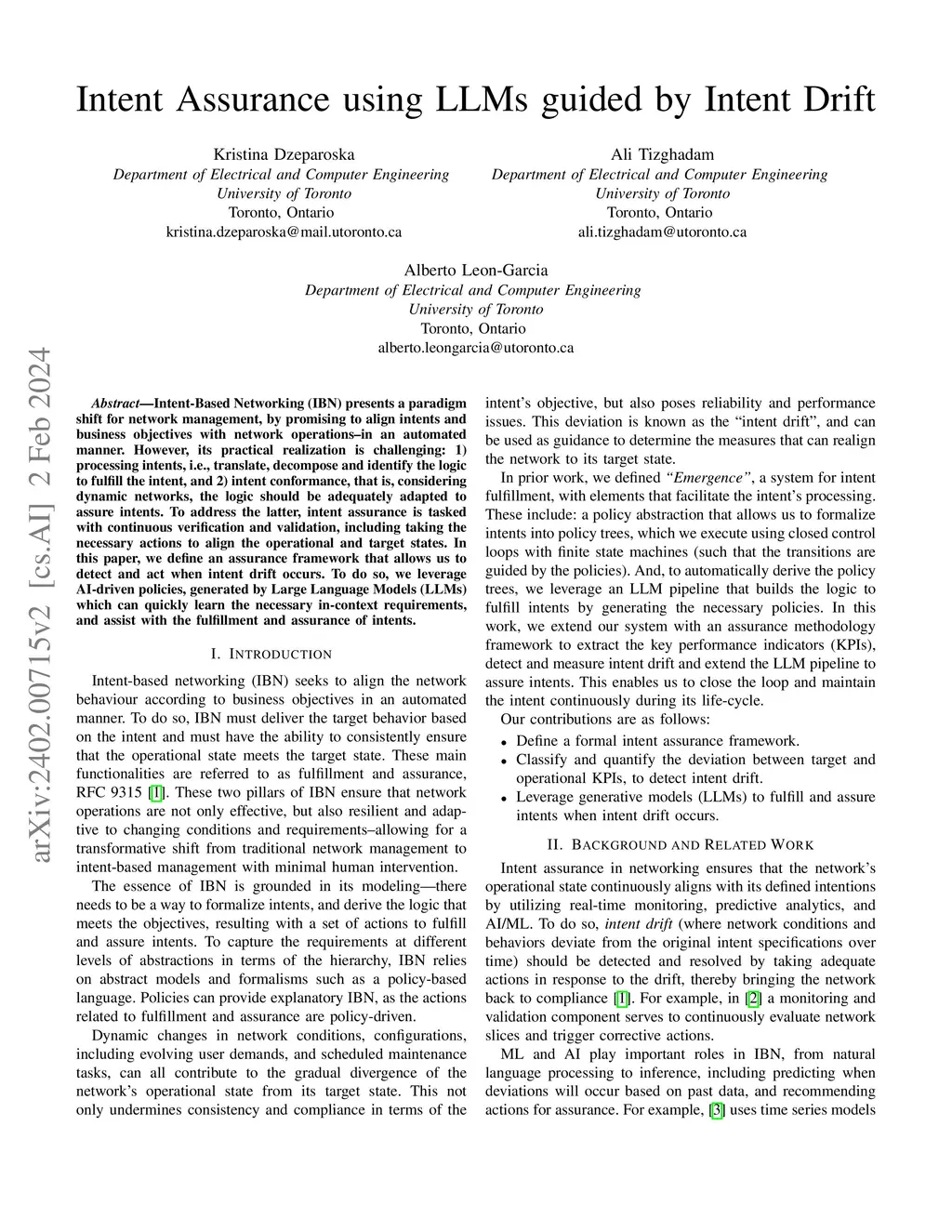 Intent-Based Networking (IBN) presents a paradigm shift for network management, by promising to align intents and business objectives with network operations--in an automated manner. However, its practical realization is challenging: 1) processing intents, i.e., translate, decompose and identify the logic to fulfill the intent, and 2) intent conformance, that is, considering dynamic networks, the logic should be adequately adapted to assure intents. To address the latter, intent assurance is tasked with continuous verification and validation, including taking the necessary actions to align the operational and target states. In this paper, we define an assurance framework that allows us to detect and act when intent drift occurs. To do so, we leverage AI-driven policies, generated by Large Language Models (LLMs) which can quickly learn the necessary in-context requirements, and assist with the fulfillment and assurance of intents.