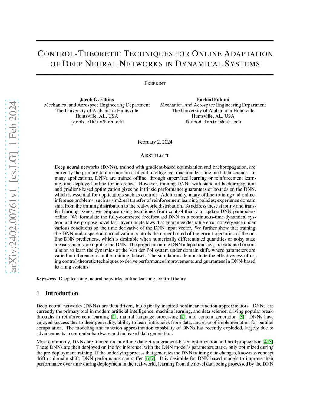 Deep neural networks (DNNs), trained with gradient-based optimization and backpropagation, are currently the primary tool in modern artificial intelligence, machine learning, and data science. In many applications, DNNs are trained offline, through supervised learning or reinforcement learning, and deployed online for inference. However, training DNNs with standard backpropagation and gradient-based optimization gives no intrinsic performance guarantees or bounds on the DNN, which is essential for applications such as controls. Additionally, many offline-training and online-inference problems, such as sim2real transfer of reinforcement learning policies, experience domain shift from the training distribution to the real-world distribution. To address these stability and transfer learning issues, we propose using techniques from control theory to update DNN parameters online. We formulate the fully-connected feedforward DNN as a continuous-time dynamical system, and we propose novel last-layer update laws that guarantee desirable error convergence under various conditions on the time derivative of the DNN input vector. We further show that training the DNN under spectral normalization controls the upper bound of the error trajectories of the online DNN predictions, which is desirable when numerically differentiated quantities or noisy state measurements are input to the DNN. The proposed online DNN adaptation laws are validated in simulation to learn the dynamics of the Van der Pol system under domain shift, where parameters are varied in inference from the training dataset. The simulations demonstrate the effectiveness of using control-theoretic techniques to derive performance improvements and guarantees in DNN-based learning systems.