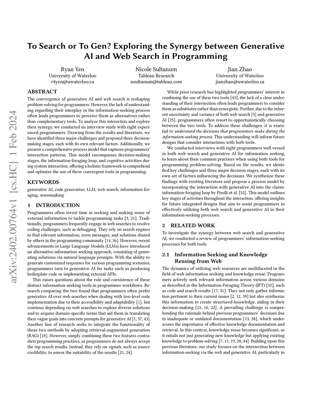 The convergence of generative AI and web search is reshaping problem-solving for programmers. However, the lack of understanding regarding their interplay in the information-seeking process often leads programmers to perceive them as alternatives rather than complementary tools. To analyze this interaction and explore their synergy, we conducted an interview study with eight experienced programmers. Drawing from the results and literature, we have identified three major challenges and proposed three decision-making stages, each with its own relevant factors. Additionally, we present a comprehensive process model that captures programmers' interaction patterns. This model encompasses decision-making stages, the information-foraging loop, and cognitive activities during system interaction, offering a holistic framework to comprehend and optimize the use of these convergent tools in programming.