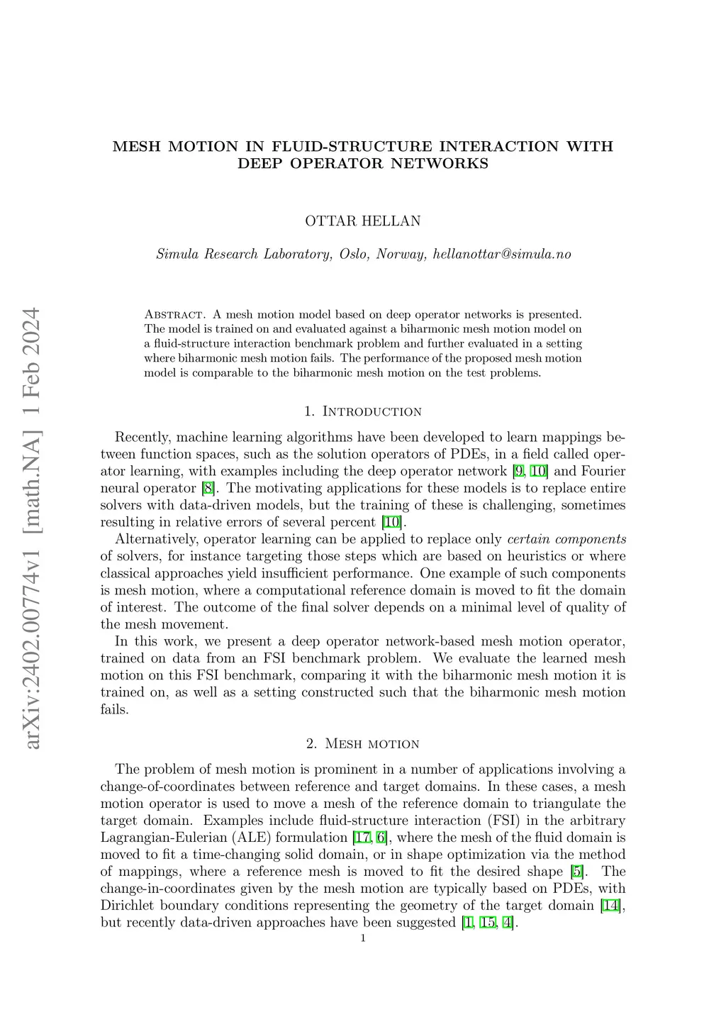 A mesh motion model based on deep operator networks is presented. The model is trained on and evaluated against a biharmonic mesh motion model on a fluid-structure interaction benchmark problem and further evaluated in a setting where biharmonic mesh motion fails. The performance of the proposed mesh motion model is comparable to the biharmonic mesh motion on the test problems.