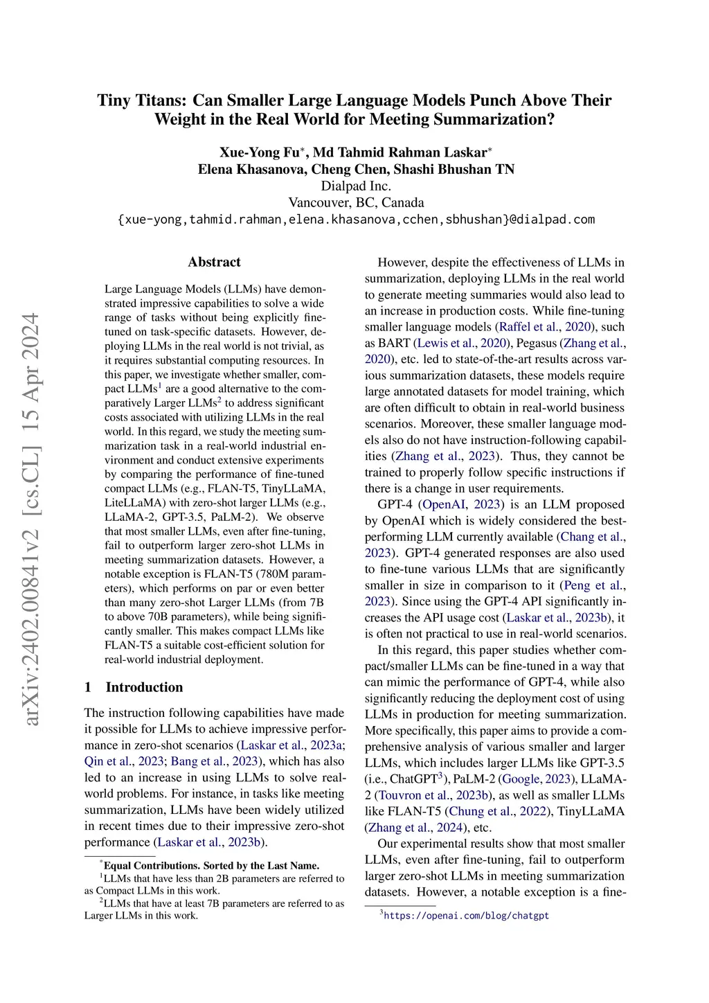 Large Language Models (LLMs) have demonstrated impressive capabilities to solve a wide range of tasks without being explicitly fine-tuned on task-specific datasets. However, deploying LLMs in the real world is not trivial, as it requires substantial computing resources. In this paper, we investigate whether smaller, compact LLMs are a good alternative to the comparatively Larger LLMs2 to address significant costs associated with utilizing LLMs in the real world. In this regard, we study the meeting summarization task in a real-world industrial environment and conduct extensive experiments by comparing the performance of fine-tuned compact LLMs (e.g., FLAN-T5, TinyLLaMA, LiteLLaMA) with zero-shot larger LLMs (e.g., LLaMA-2, GPT-3.5, PaLM-2). We observe that most smaller LLMs, even after fine-tuning, fail to outperform larger zero-shot LLMs in meeting summarization datasets. However, a notable exception is FLAN-T5 (780M parameters), which performs on par or even better than many zero-shot Larger LLMs (from 7B to above 70B parameters), while being significantly smaller. This makes compact LLMs like FLAN-T5 a suitable cost-efficient solution for real-world industrial deployment.