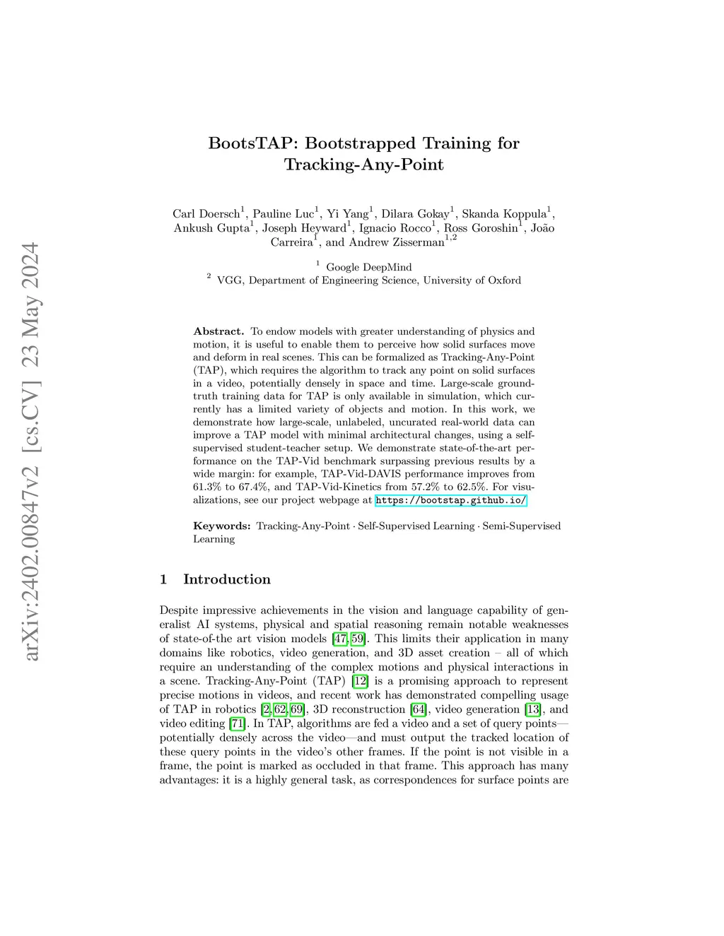 To endow models with greater understanding of physics and motion, it is useful to enable them to perceive how solid surfaces move and deform in real scenes. This can be formalized as Tracking-Any-Point (TAP), which requires the algorithm to track any point on solid surfaces in a video, potentially densely in space and time. Large-scale groundtruth training data for TAP is only available in simulation, which currently has a limited variety of objects and motion. In this work, we demonstrate how large-scale, unlabeled, uncurated real-world data can improve a TAP model with minimal architectural changes, using a selfsupervised student-teacher setup. We demonstrate state-of-the-art performance on the TAP-Vid benchmark surpassing previous results by a wide margin: for example, TAP-Vid-DAVIS performance improves from 61.3% to 67.4%, and TAP-Vid-Kinetics from 57.2% to 62.5%. For visualizations, see our project webpage at https://bootstap.github.io/