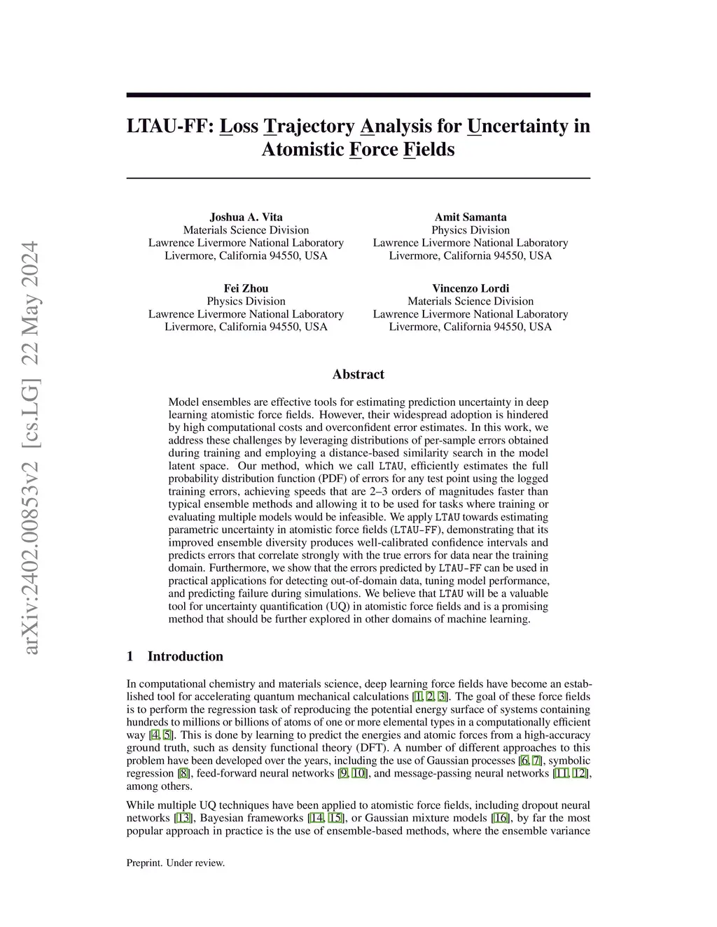 Model ensembles are effective tools for estimating prediction uncertainty in deep learning atomistic force fields. However, their widespread adoption is hindered by high computational costs and overconfident error estimates. In this work, we address these challenges by leveraging distributions of per-sample errors obtained during training and employing a distance-based similarity search in the model latent space. Our method, which we call LTAU, efficiently estimates the full probability distribution function (PDF) of errors for any test point using the logged training errors, achieving speeds that are 2--3 orders of magnitudes faster than typical ensemble methods and allowing it to be used for tasks where training or evaluating multiple models would be infeasible. We apply LTAU towards estimating parametric uncertainty in atomistic force fields (LTAU-FF), demonstrating that its improved ensemble diversity produces well-calibrated confidence intervals and predicts errors that correlate strongly with the true errors for data near the training domain. Furthermore, we show that the errors predicted by LTAU-FF can be used in practical applications for detecting out-of-domain data, tuning model performance, and predicting failure during simulations. We believe that LTAU will be a valuable tool for uncertainty quantification (UQ) in atomistic force fields and is a promising method that should be further explored in other domains of machine learning.