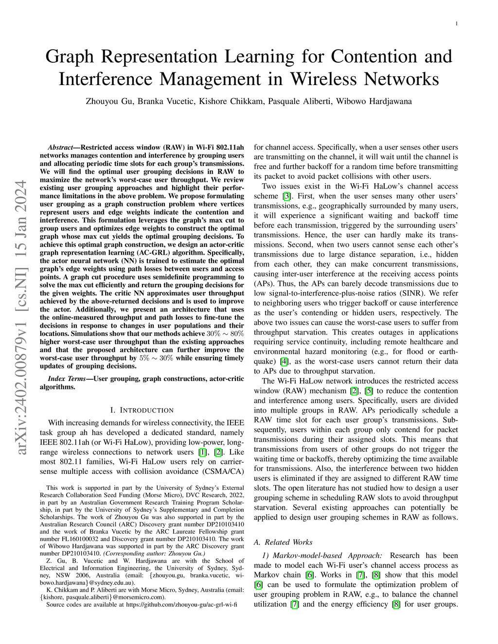 Restricted access window (RAW) in Wi-Fi 802.11ah networks manages contention and interference by grouping users and allocating periodic time slots for each group's transmissions. We will find the optimal user grouping decisions in RAW to maximize the network's worst-case user throughput. We review existing user grouping approaches and highlight their performance limitations in the above problem. We propose formulating user grouping as a graph construction problem where vertices represent users and edge weights indicate the contention and interference. This formulation leverages the graph's max cut to group users and optimizes edge weights to construct the optimal graph whose max cut yields the optimal grouping decisions. To achieve this optimal graph construction, we design an actor-critic graph representation learning (AC-GRL) algorithm. Specifically, the actor neural network (NN) is trained to estimate the optimal graph's edge weights using path losses between users and access points. A graph cut procedure uses semidefinite programming to solve the max cut efficiently and return the grouping decisions for the given weights. The critic NN approximates user throughput achieved by the above-returned decisions and is used to improve the actor. Additionally, we present an architecture that uses the online-measured throughput and path losses to fine-tune the decisions in response to changes in user populations and their locations. Simulations show that our methods achieve higher worst-case user throughput than the existing approaches and that the proposed architecture can further improve the worst-case user throughput by while ensuring timely updates of grouping decisions.