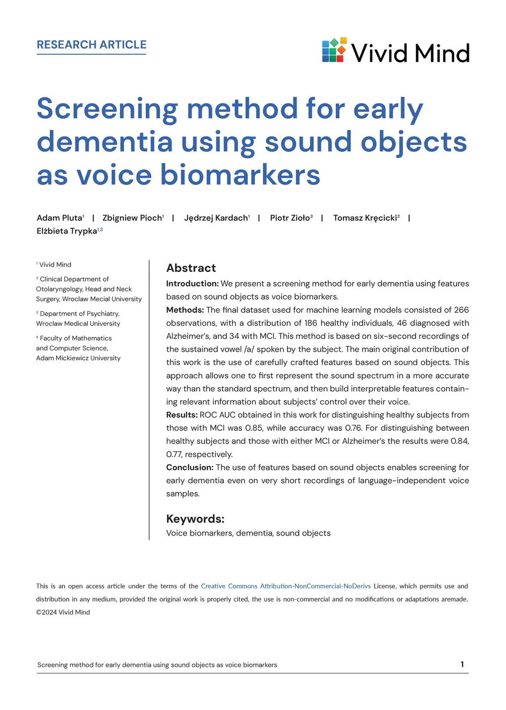 Introduction: We present a screening method for early dementia using features based on sound objects as voice biomarkers. Methods: The final dataset used for machine learning models consisted of 266 observations, with a distribution of 186 healthy individuals, 46 diagnosed with Alzheimer's, and 34 with MCI. This method is based on six-second recordings of the sustained vowel /a/ spoken by the subject. The main original contribution of this work is the use of carefully crafted features based on sound objects. This approach allows one to first represent the sound spectrum in a more accurate way than the standard spectrum, and then build interpretable features containing relevant information about subjects' control over their voice. Results: ROC AUC obtained in this work for distinguishing healthy subjects from those with MCI was 0.85, while accuracy was 0.76. For distinguishing between healthy subjects and those with either MCI or Alzheimer's the results were 0.84, 0.77, respectively. Conclusion: The use of features based on sound objects enables screening for early dementia even on very short recordings of language-independent voice samples.