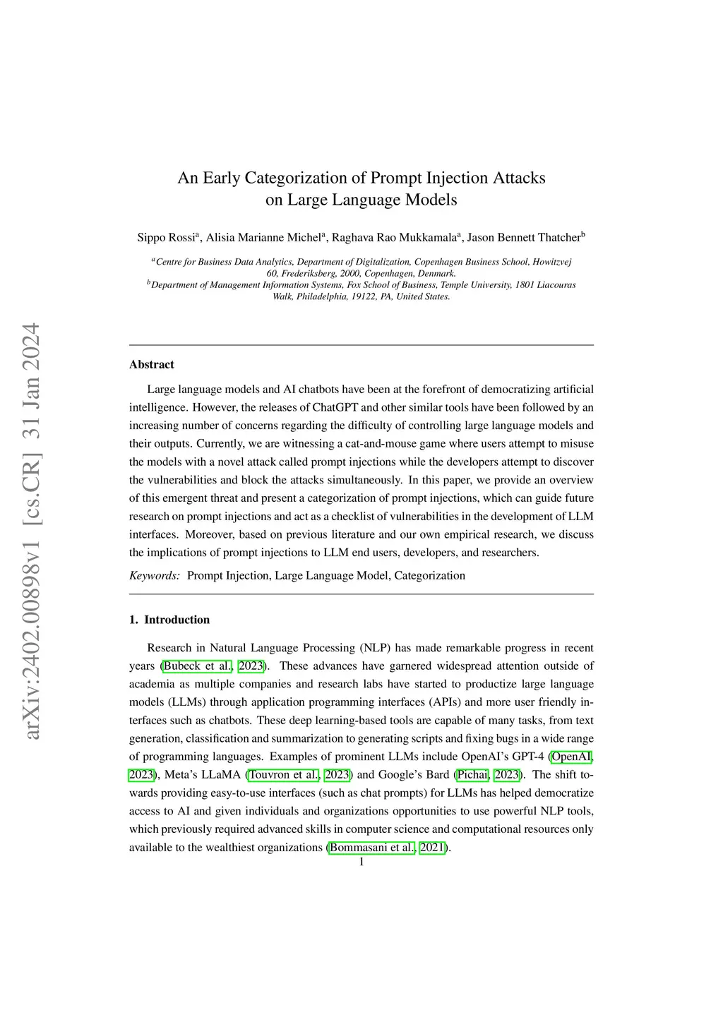 An Early Categorization of Prompt Injection Attacks on Large Language