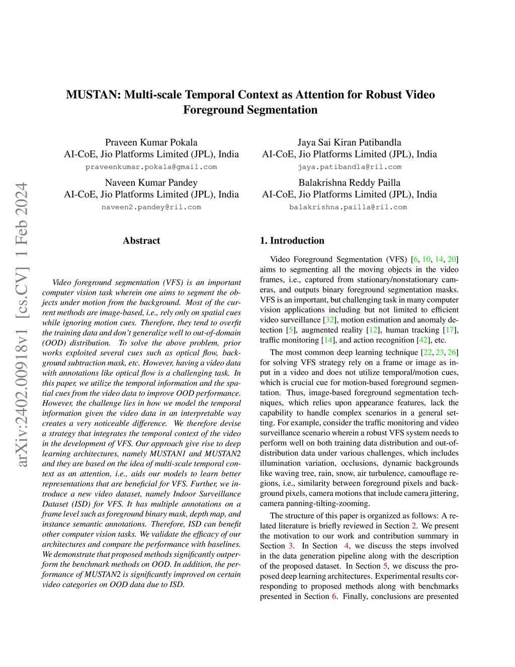 Video foreground segmentation (VFS) is an important computer vision task wherein one aims to segment the objects under motion from the background. Most of the current methods are image-based, i.e., rely only on spatial cues while ignoring motion cues. Therefore, they tend to overfit the training data and don't generalize well to out-of-domain (OOD) distribution. To solve the above problem, prior works exploited several cues such as optical flow, background subtraction mask, etc. However, having a video data with annotations like optical flow is a challenging task. In this paper, we utilize the temporal information and the spatial cues from the video data to improve OOD performance. However, the challenge lies in how we model the temporal information given the video data in an interpretable way creates a very noticeable difference. We therefore devise a strategy that integrates the temporal context of the video in the development of VFS. Our approach give rise to deep learning architectures, namely MUSTAN1 and MUSTAN2 and they are based on the idea of multi-scale temporal context as an attention, i.e., aids our models to learn better representations that are beneficial for VFS. Further, we introduce a new video dataset, namely Indoor Surveillance Dataset (ISD) for VFS. It has multiple annotations on a frame level such as foreground binary mask, depth map, and instance semantic annotations. Therefore, ISD can benefit other computer vision tasks. We validate the efficacy of our architectures and compare the performance with baselines. We demonstrate that proposed methods significantly outperform the benchmark methods on OOD. In addition, the performance of MUSTAN2 is significantly improved on certain video categories on OOD data due to ISD.