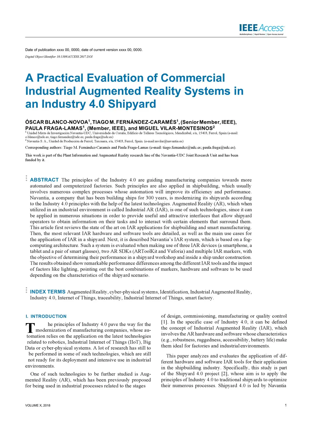 The principles of the Industry 4.0 are guiding manufacturing companies towards more automated and computerized factories. Such principles are also applied in shipbuilding, which usually involves numerous complex processes whose automation will improve its efficiency and performance. Navantia, a company that has been building ships for 300 years, is modernizing its shipyards according to the Industry 4.0 principles with the help of the latest technologies. Augmented Reality (AR), which when utilized in an industrial environment is called Industrial AR (IAR), is one of such technologies, since it can be applied in numerous situations in order to provide useful and attractive interfaces that allow shipyard operators to obtain information on their tasks and to interact with certain elements that surround them. This article first reviews the state of the art on IAR applications for shipbuilding and smart manufacturing. Then, the most relevant IAR hardware and software tools are detailed, as well as the main use cases for the application of IAR in a shipyard. Next, it is described Navantia's IAR system, which is based on a fog-computing architecture. Such a system is evaluated when making use of three IAR devices (a smartphone, a tablet and a pair of smart glasses), two AR SDKs (ARToolKit and Vuforia) and multiple IAR markers, with the objective of determining their performance in a shipyard workshop and inside a ship under construction. The results obtained show remarkable performance differences among the different IAR tools and the impact of factors like lighting, pointing out the best combinations of markers, hardware and software to be used depending on the characteristics of the shipyard scenario.