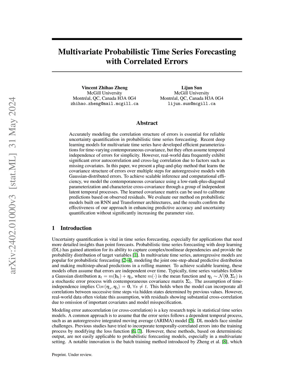 Accurately modeling the correlation structure of errors is essential for reliable uncertainty quantification in probabilistic time series forecasting. Recent deep learning models for multivariate time series have developed efficient parameterizations for time-varying contemporaneous covariance, but they often assume temporal independence of errors for simplicity. However, real-world data frequently exhibit significant error autocorrelation and cross-lag correlation due to factors such as missing covariates. In this paper, we present a plug-and-play method that learns the covariance structure of errors over multiple steps for autoregressive models with Gaussian-distributed errors. To achieve scalable inference and computational efficiency, we model the contemporaneous covariance using a low-rank-plus-diagonal parameterization and characterize cross-covariance through a group of independent latent temporal processes. The learned covariance matrix can be used to calibrate predictions based on observed residuals. We evaluate our method on probabilistic models built on RNN and Transformer architectures, and the results confirm the effectiveness of our approach in enhancing predictive accuracy and uncertainty quantification without significantly increasing the parameter size.