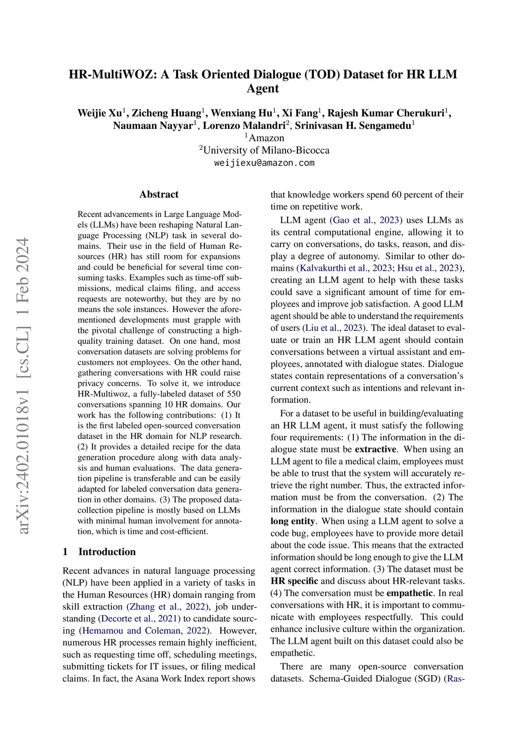 Recent advancements in Large Language Models (LLMs) have been reshaping Natural Language Processing (NLP) task in several domains. Their use in the field of Human Resources (HR) has still room for expansions and could be beneficial for several time consuming tasks. Examples such as time-off submissions, medical claims filing, and access requests are noteworthy, but they are by no means the sole instances. However, the aforementioned developments must grapple with the pivotal challenge of constructing a high-quality training dataset. On one hand, most conversation datasets are solving problems for customers not employees. On the other hand, gathering conversations with HR could raise privacy concerns. To solve it, we introduce HR-Multiwoz, a fully-labeled dataset of 550 conversations spanning 10 HR domains to evaluate LLM Agent. Our work has the following contributions: (1) It is the first labeled open-sourced conversation dataset in the HR domain for NLP research. (2) It provides a detailed recipe for the data generation procedure along with data analysis and human evaluations. The data generation pipeline is transferable and can be easily adapted for labeled conversation data generation in other domains. (3) The proposed data-collection pipeline is mostly based on LLMs with minimal human involvement for annotation, which is time and cost-efficient.