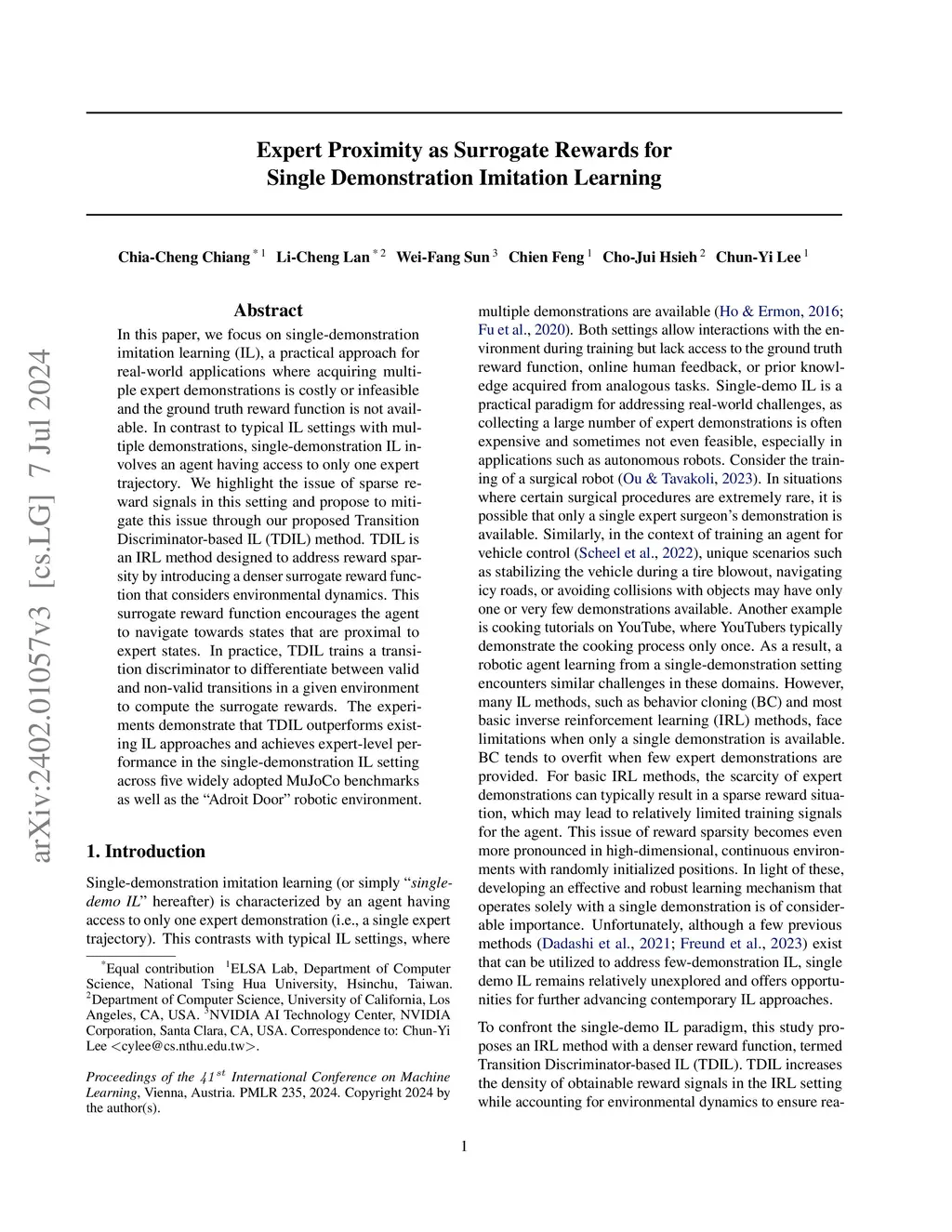 In this paper, we focus on single-demonstration imitation learning (IL), a practical approach for real-world applications where acquiring multiple expert demonstrations is costly or infeasible and the ground truth reward function is not available. In contrast to typical IL settings with multiple demonstrations, single-demonstration IL involves an agent having access to only one expert trajectory. We highlight the issue of sparse reward signals in this setting and propose to mitigate this issue through our proposed Transition Discriminator-based IL (TDIL) method. TDIL is an IRL method designed to address reward sparsity by introducing a denser surrogate reward function that considers environmental dynamics. This surrogate reward function encourages the agent to navigate towards states that are proximal to expert states. In practice, TDIL trains a transition discriminator to differentiate between valid and non-valid transitions in a given environment to compute the surrogate rewards. The experiments demonstrate that TDIL outperforms existing IL approaches and achieves expert-level performance in the single-demonstration IL setting across five widely adopted MuJoCo benchmarks as well as the "Adroit Door" robotic environment.