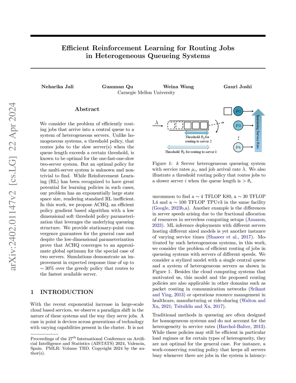 We consider the problem of efficiently routing jobs that arrive into a central queue to a system of heterogeneous servers. Unlike homogeneous systems, a threshold policy, that routes jobs to the slow server(s) when the queue length exceeds a certain threshold, is known to be optimal for the one-fast-one-slow two-server system. But an optimal policy for the multi-server system is unknown and non-trivial to find. While Reinforcement Learning (RL) has been recognized to have great potential for learning policies in such cases, our problem has an exponentially large state space size, rendering standard RL inefficient. In this work, we propose ACHQ, an efficient policy gradient based algorithm with a low dimensional soft threshold policy parameterization that leverages the underlying queueing structure. We provide stationary-point convergence guarantees for the general case and despite the low-dimensional parameterization prove that ACHQ converges to an approximate global optimum for the special case of two servers. Simulations demonstrate an improvement in expected response time of up to ~30% over the greedy policy that routes to the fastest available server.