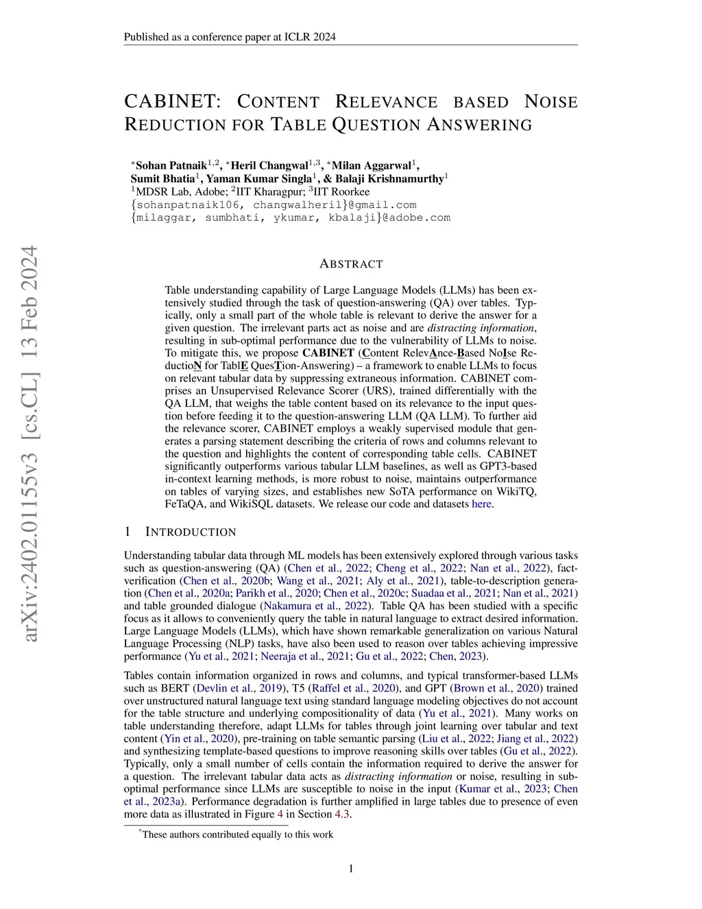 CABINET: Content Relevance based Noise Reduction for Table Question
