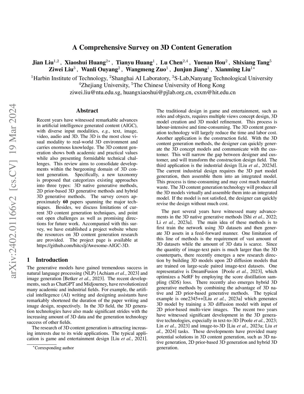 Recent years have witnessed remarkable advances in artificial intelligence generated content(AIGC), with diverse input modalities, e.g., text, image, video, audio and 3D. The 3D is the most close visual modality to real-world 3D environment and carries enormous knowledge. The 3D content generation shows both academic and practical values while also presenting formidable technical challenges. This review aims to consolidate developments within the burgeoning domain of 3D content generation. Specifically, a new taxonomy is proposed that categorizes existing approaches into three types: 3D native generative methods, 2D prior-based 3D generative methods, and hybrid 3D generative methods. The survey covers approximately 60 papers spanning the major techniques. Besides, we discuss limitations of current 3D content generation techniques, and point out open challenges as well as promising directions for future work. Accompanied with this survey, we have established a project website where the resources on 3D content generation research are provided. The project page is available at https://github.com/hitcslj/Awesome-AIGC-3D.