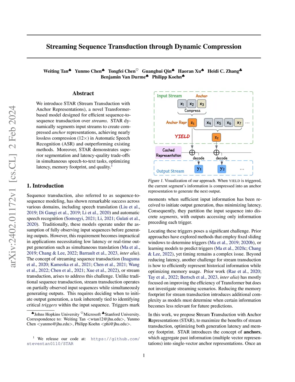 We introduce STAR (Stream Transduction with Anchor Representations), a novel Transformer-based model designed for efficient sequence-to-sequence transduction over streams. STAR dynamically segments input streams to create compressed anchor representations, achieving nearly lossless compression (12x) in Automatic Speech Recognition (ASR) and outperforming existing methods. Moreover, STAR demonstrates superior segmentation and latency-quality trade-offs in simultaneous speech-to-text tasks, optimizing latency, memory footprint, and quality.