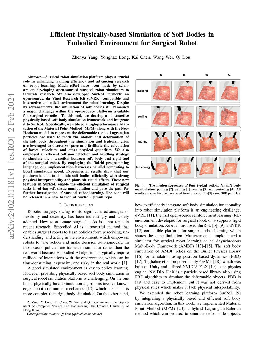 Surgical robot simulation platform plays a crucial role in enhancing training efficiency and advancing research on robot learning. Much effort have been made by scholars on developing open-sourced surgical robot simulators to facilitate research. We also developed SurRoL formerly, an open-source, da Vinci Research Kit (dVRK) compatible and interactive embodied environment for robot learning. Despite its advancements, the simulation of soft bodies still remained a major challenge within the open-source platforms available for surgical robotics. To this end, we develop an interactive physically based soft body simulation framework and integrate it to SurRoL. Specifically, we utilized a high-performance adaptation of the Material Point Method (MPM) along with the Neo-Hookean model to represent the deformable tissue. Lagrangian particles are used to track the motion and deformation of the soft body throughout the simulation and Eulerian grids are leveraged to discretize space and facilitate the calculation of forces, velocities, and other physical quantities. We also employed an efficient collision detection and handling strategy to simulate the interaction between soft body and rigid tool of the surgical robot. By employing the Taichi programming language, our implementation harnesses parallel computing to boost simulation speed. Experimental results show that our platform is able to simulate soft bodies efficiently with strong physical interpretability and plausible visual effects. These new features in SurRoL enable the efficient simulation of surgical tasks involving soft tissue manipulation and pave the path for further investigation of surgical robot learning. The code will be released in a new branch of SurRoL github repo.