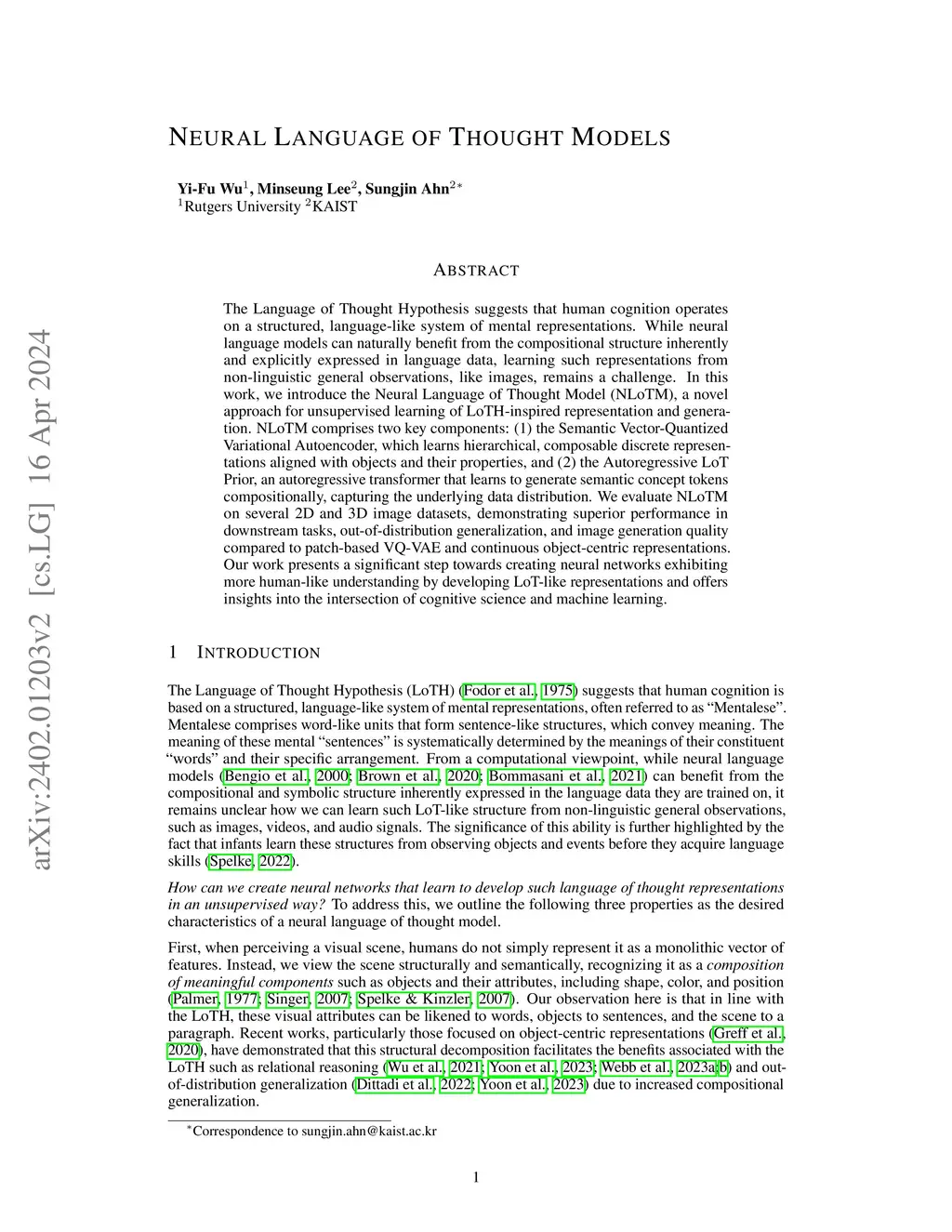 The Language of Thought Hypothesis suggests that human cognition operates on a structured, language-like system of mental representations. While neural language models can naturally benefit from the compositional structure inherently and explicitly expressed in language data, learning such representations from non-linguistic general observations, like images, remains a challenge. In this work, we introduce the Neural Language of Thought Model (NLoTM), a novel approach for unsupervised learning of LoTH-inspired representation and generation. NLoTM comprises two key components: (1) the Semantic Vector-Quantized Variational Autoencoder, which learns hierarchical, composable discrete representations aligned with objects and their properties, and (2) the Autoregressive LoT Prior, an autoregressive transformer that learns to generate semantic concept tokens compositionally, capturing the underlying data distribution. We evaluate NLoTM on several 2D and 3D image datasets, demonstrating superior performance in downstream tasks, out-of-distribution generalization, and image generation quality compared to patch-based VQ-VAE and continuous object-centric representations. Our work presents a significant step towards creating neural networks exhibiting more human-like understanding by developing LoT-like representations and offers insights into the intersection of cognitive science and machine learning.