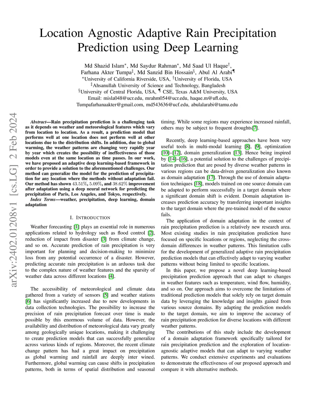 Location Agnostic Adaptive Rain Precipitation Prediction using Deep