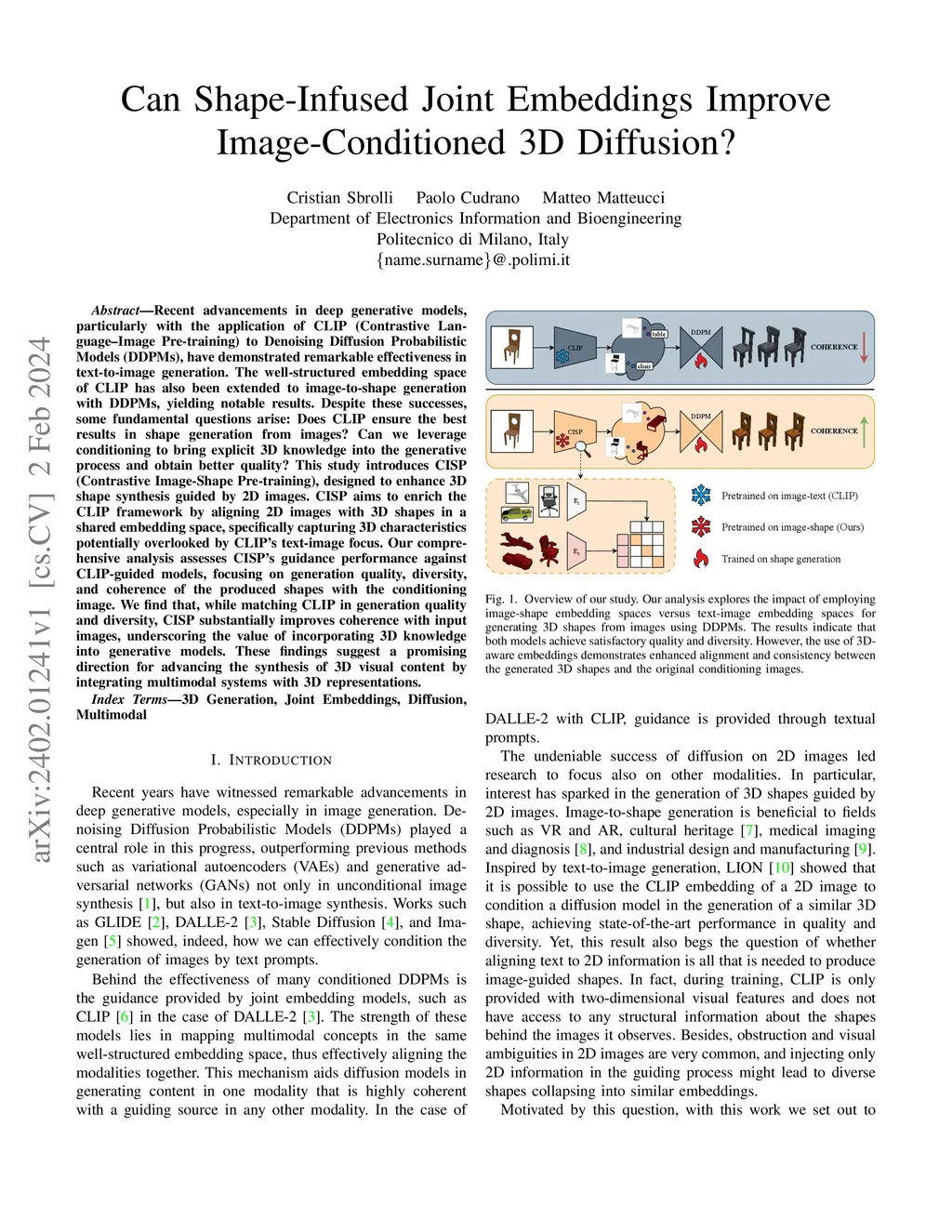 Recent advancements in deep generative models, particularly with the application of CLIP (Contrastive Language Image Pretraining) to Denoising Diffusion Probabilistic Models (DDPMs), have demonstrated remarkable effectiveness in text to image generation. The well structured embedding space of CLIP has also been extended to image to shape generation with DDPMs, yielding notable results. Despite these successes, some fundamental questions arise: Does CLIP ensure the best results in shape generation from images? Can we leverage conditioning to bring explicit 3D knowledge into the generative process and obtain better quality? This study introduces CISP (Contrastive Image Shape Pre training), designed to enhance 3D shape synthesis guided by 2D images. CISP aims to enrich the CLIP framework by aligning 2D images with 3D shapes in a shared embedding space, specifically capturing 3D characteristics potentially overlooked by CLIP's text image focus. Our comprehensive analysis assesses CISP's guidance performance against CLIP guided models, focusing on generation quality, diversity, and coherence of the produced shapes with the conditioning image. We find that, while matching CLIP in generation quality and diversity, CISP substantially improves coherence with input images, underscoring the value of incorporating 3D knowledge into generative models. These findings suggest a promising direction for advancing the synthesis of 3D visual content by integrating multimodal systems with 3D representations.