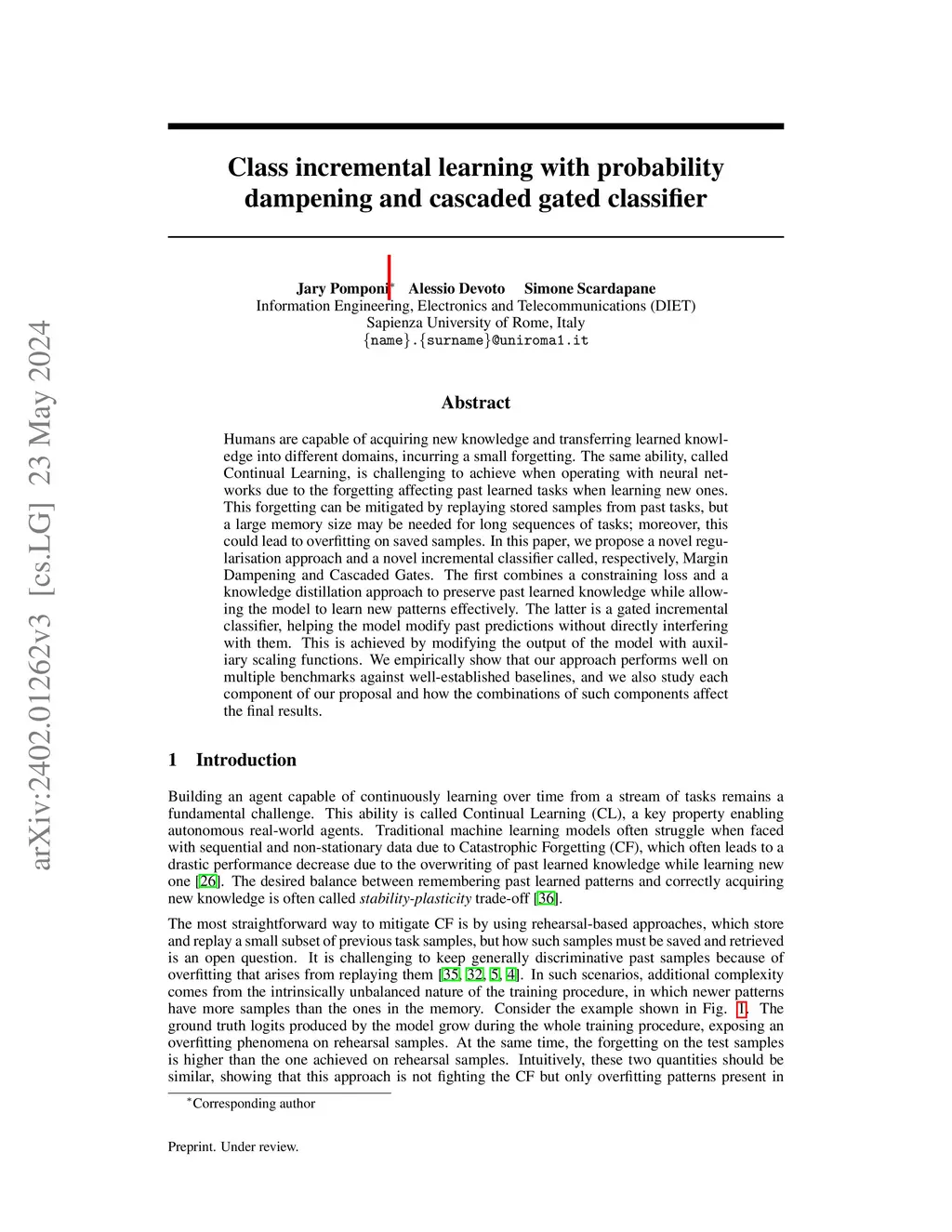 Humans are capable of acquiring new knowledge and transferring learned knowledge into different domains, incurring a small forgetting. The same ability, called Continual Learning, is challenging to achieve when operating with neural networks due to the forgetting affecting past learned tasks when learning new ones. This forgetting can be mitigated by replaying stored samples from past tasks, but a large memory size may be needed for long sequences of tasks; moreover, this could lead to overfitting on saved samples. In this paper, we propose a novel regularisation approach and a novel incremental classifier called, respectively, Margin Dampening and Cascaded Scaling Classifier. The first combines a soft constraint and a knowledge distillation approach to preserve past learned knowledge while allowing the model to learn new patterns effectively. The latter is a gated incremental classifier, helping the model modify past predictions without directly interfering with them. This is achieved by modifying the output of the model with auxiliary scaling functions. We empirically show that our approach performs well on multiple benchmarks against well-established baselines, and we also study each component of our proposal and how the combinations of such components affect the final results.