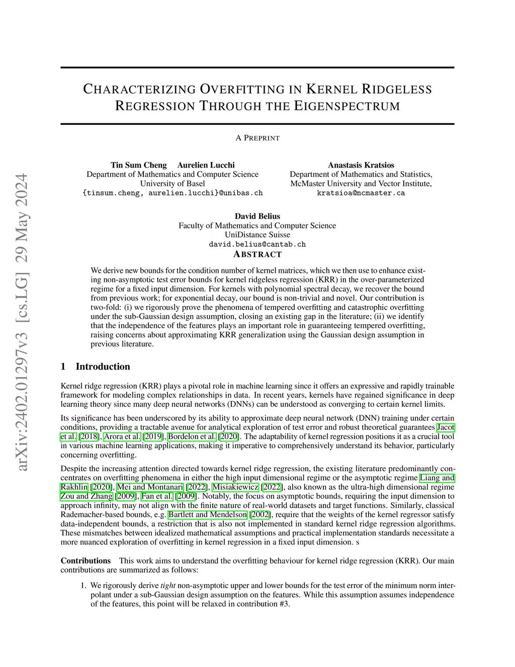 We derive new bounds for the condition number of kernel matrices, which we then use to enhance existing non-asymptotic test error bounds for kernel ridgeless regression (KRR) in the over-parameterized regime for a fixed input dimension. For kernels with polynomial spectral decay, we recover the bound from previous work; for exponential decay, our bound is non-trivial and novel. Our contribution is two-fold: (i) we rigorously prove the phenomena of tempered overfitting and catastrophic overfitting under the sub-Gaussian design assumption, closing an existing gap in the literature; (ii) we identify that the independence of the features plays an important role in guaranteeing tempered overfitting, raising concerns about approximating KRR generalization using the Gaussian design assumption in previous literature.