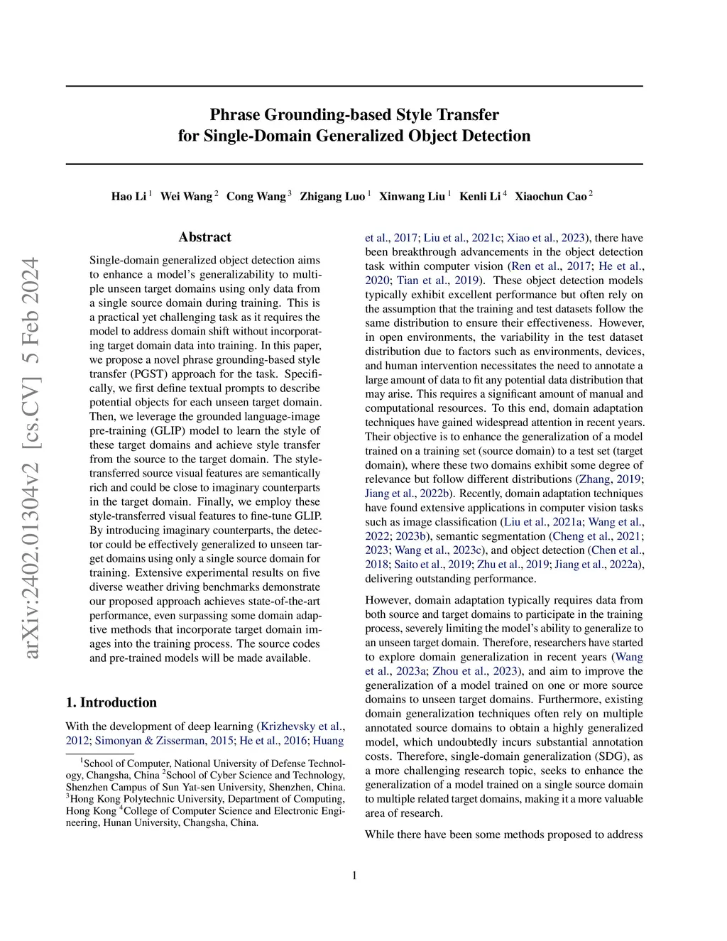 Single-domain generalized object detection aims to enhance a model's generalizability to multiple unseen target domains using only data from a single source domain during training. This is a practical yet challenging task as it requires the model to address domain shift without incorporating target domain data into training. In this paper, we propose a novel phrase grounding-based style transfer (PGST) approach for the task. Specifically, we first define textual prompts to describe potential objects for each unseen target domain. Then, we leverage the grounded language-image pre-training (GLIP) model to learn the style of these target domains and achieve style transfer from the source to the target domain. The style-transferred source visual features are semantically rich and could be close to imaginary counterparts in the target domain. Finally, we employ these style-transferred visual features to fine-tune GLIP. By introducing imaginary counterparts, the detector could be effectively generalized to unseen target domains using only a single source domain for training. Extensive experimental results on five diverse weather driving benchmarks demonstrate our proposed approach achieves state-of-the-art performance, even surpassing some domain adaptive methods that incorporate target domain images into the training process.The source codes and pre-trained models will be made available.
