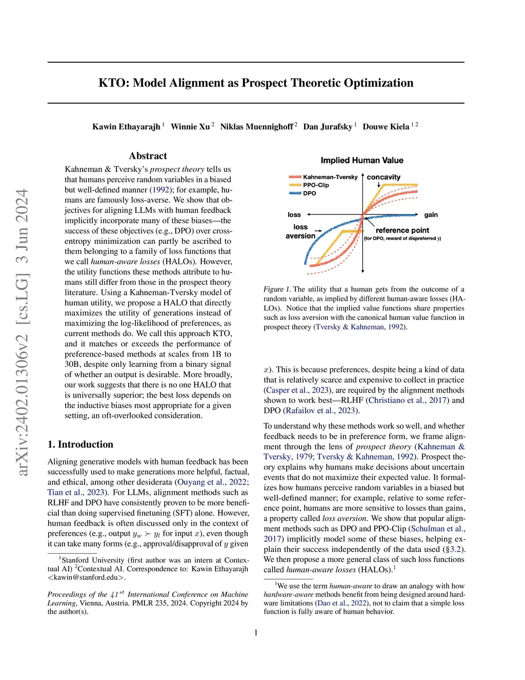 KTO: Model Alignment as Prospect Theoretic Optimization