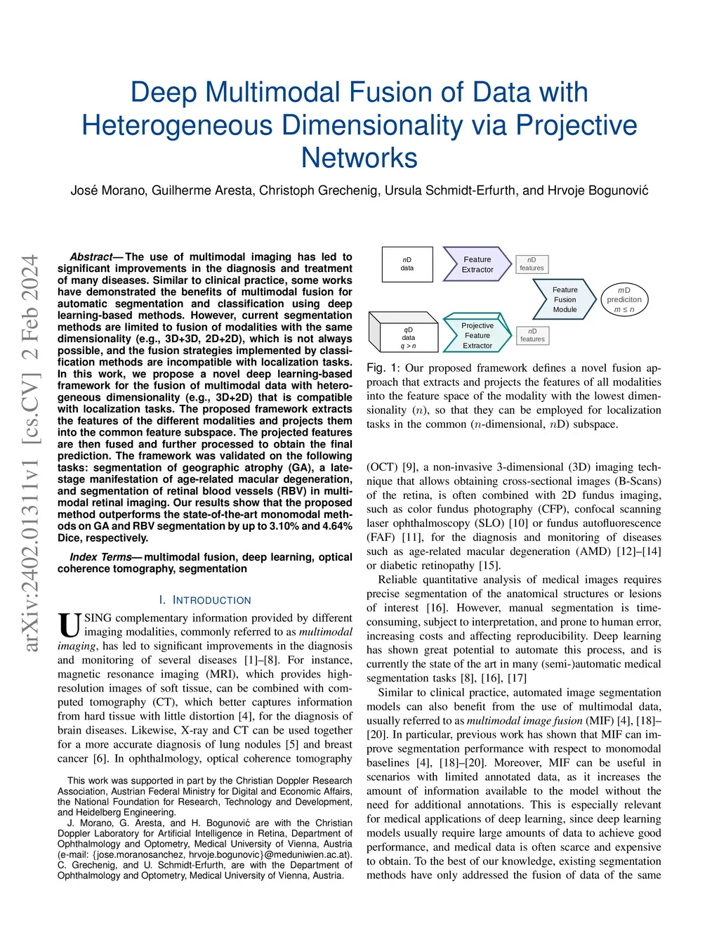 The use of multimodal imaging has led to significant improvements in the diagnosis and treatment of many diseases. Similar to clinical practice, some works have demonstrated the benefits of multimodal fusion for automatic segmentation and classification using deep learning-based methods. However, current segmentation methods are limited to fusion of modalities with the same dimensionality (e.g., 3D+3D, 2D+2D), which is not always possible, and the fusion strategies implemented by classification methods are incompatible with localization tasks. In this work, we propose a novel deep learning-based framework for the fusion of multimodal data with heterogeneous dimensionality (e.g., 3D+2D) that is compatible with localization tasks. The proposed framework extracts the features of the different modalities and projects them into the common feature subspace. The projected features are then fused and further processed to obtain the final prediction. The framework was validated on the following tasks: segmentation of geographic atrophy (GA), a late-stage manifestation of age-related macular degeneration, and segmentation of retinal blood vessels (RBV) in multimodal retinal imaging. Our results show that the proposed method outperforms the state-of-the-art monomodal methods on GA and RBV segmentation by up to 3.10% and 4.64% Dice, respectively.