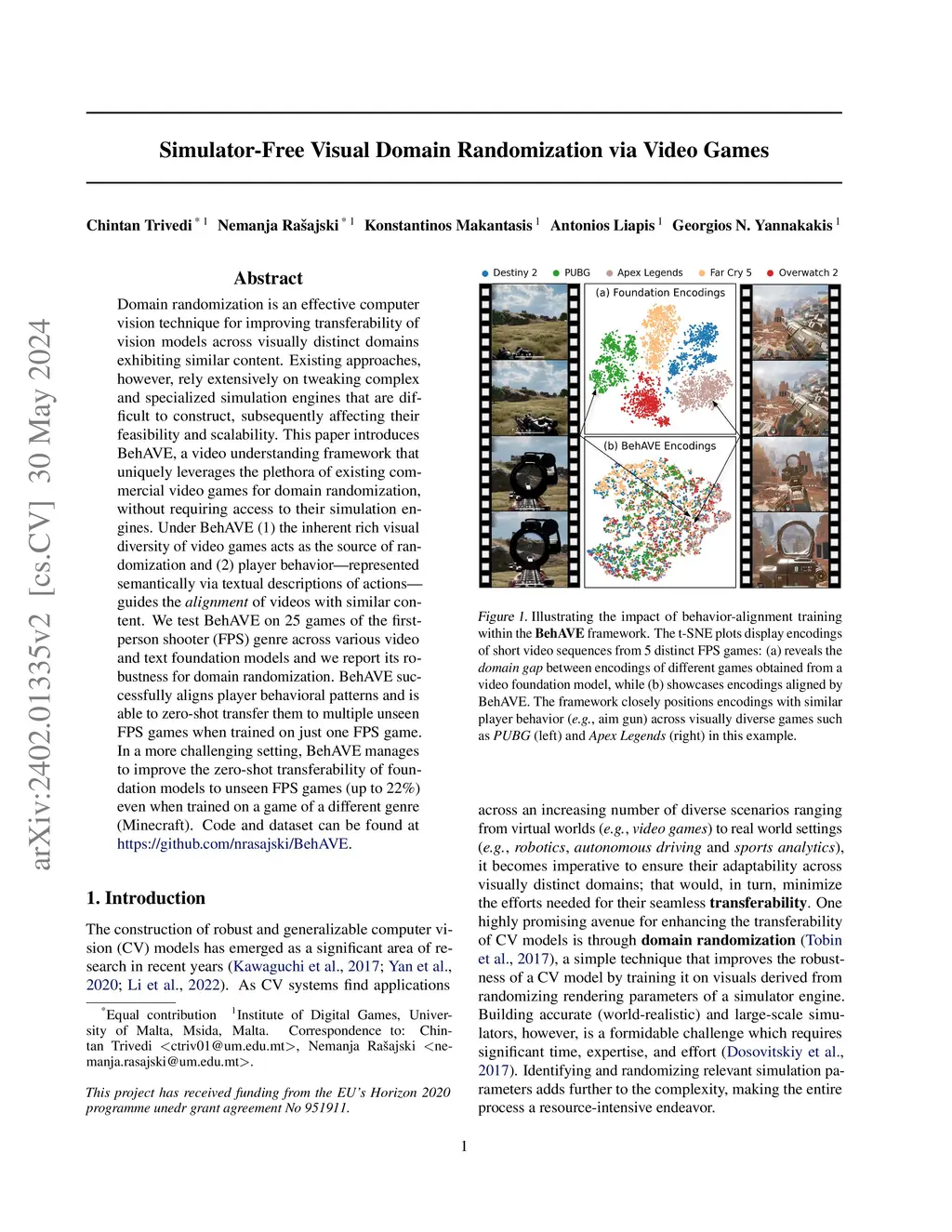 Domain randomization is an effective computer vision technique for improving transferability of vision models across visually distinct domains exhibiting similar content. Existing approaches, however, rely extensively on tweaking complex and specialized simulation engines that are difficult to construct, subsequently affecting their feasibility and scalability. This paper introduces BehAVE, a video understanding framework that uniquely leverages the plethora of existing commercial video games for domain randomization, without requiring access to their simulation engines. Under BehAVE (1) the inherent rich visual diversity of video games acts as the source of randomization and (2) player behavior -- represented semantically via textual descriptions of actions -- guides the *alignment* of videos with similar content. We test BehAVE on 25 games of the first-person shooter (FPS) genre across various video and text foundation models and we report its robustness for domain randomization. BehAVE successfully aligns player behavioral patterns and is able to zero-shot transfer them to multiple unseen FPS games when trained on just one FPS game. In a more challenging setting, BehAVE manages to improve the zero-shot transferability of foundation models to unseen FPS games (up to 22%) even when trained on a game of a different genre (Minecraft). Code and dataset can be found at https://github.com/nrasajski/BehAVE.