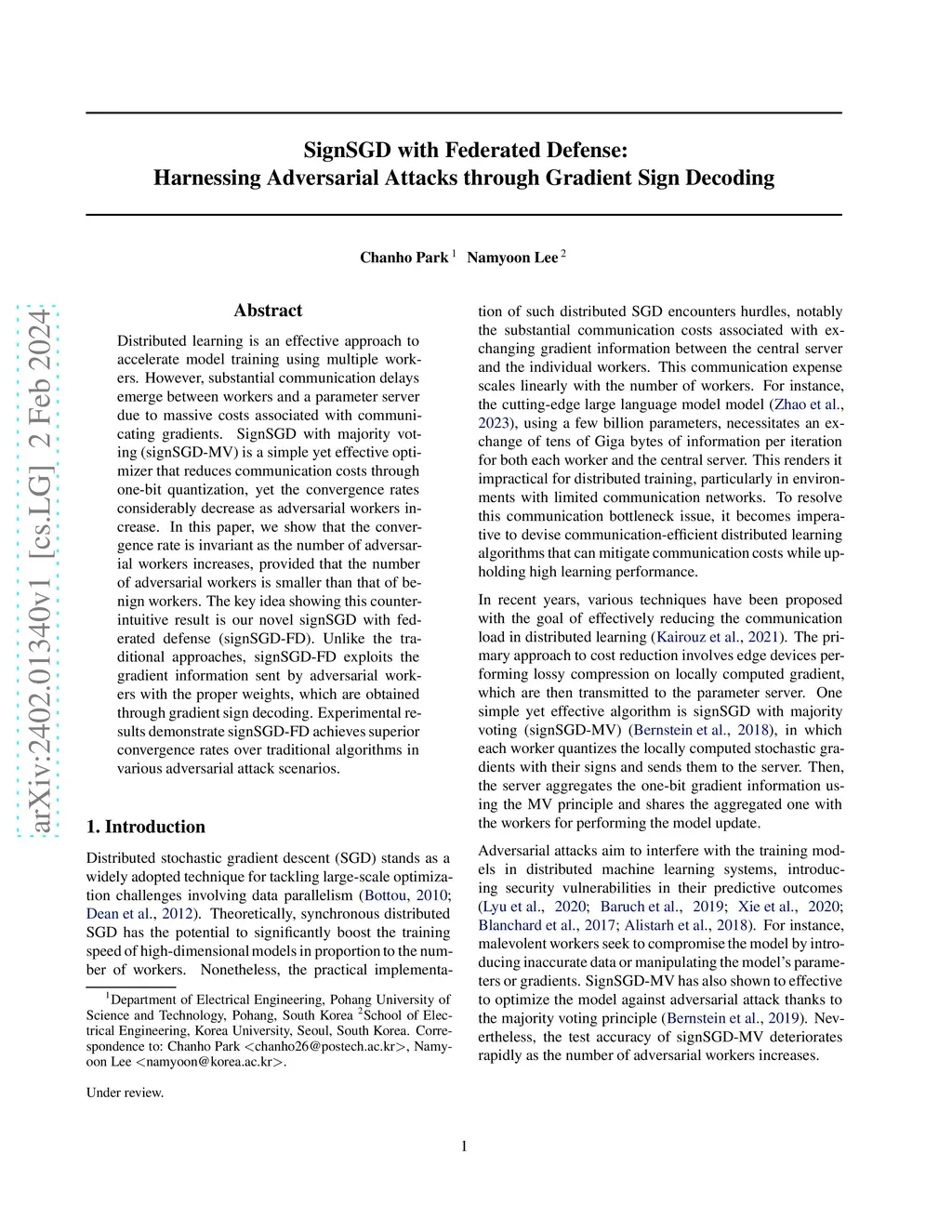 Distributed learning is an effective approach to accelerate model training using multiple workers. However, substantial communication delays emerge between workers and a parameter server due to massive costs associated with communicating gradients. SignSGD with majority voting (signSGD-MV) is a simple yet effective optimizer that reduces communication costs through one-bit quantization, yet the convergence rates considerably decrease as adversarial workers increase. In this paper, we show that the convergence rate is invariant as the number of adversarial workers increases, provided that the number of adversarial workers is smaller than that of benign workers. The key idea showing this counter-intuitive result is our novel signSGD with federated defense (signSGD-FD). Unlike the traditional approaches, signSGD-FD exploits the gradient information sent by adversarial workers with the proper weights, which are obtained through gradient sign decoding. Experimental results demonstrate signSGD-FD achieves superior convergence rates over traditional algorithms in various adversarial attack scenarios.