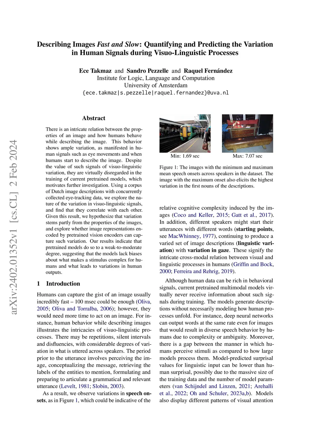 There is an intricate relation between the properties of an image and how humans behave while describing the image. This behavior shows ample variation, as manifested in human signals such as eye movements and when humans start to describe the image. Despite the value of such signals of visuo-linguistic variation, they are virtually disregarded in the training of current pretrained models, which motivates further investigation. Using a corpus of Dutch image descriptions with concurrently collected eye-tracking data, we explore the nature of the variation in visuo-linguistic signals, and find that they correlate with each other. Given this result, we hypothesize that variation stems partly from the properties of the images, and explore whether image representations encoded by pretrained vision encoders can capture such variation. Our results indicate that pretrained models do so to a weak-to-moderate degree, suggesting that the models lack biases about what makes a stimulus complex for humans and what leads to variations in human outputs.