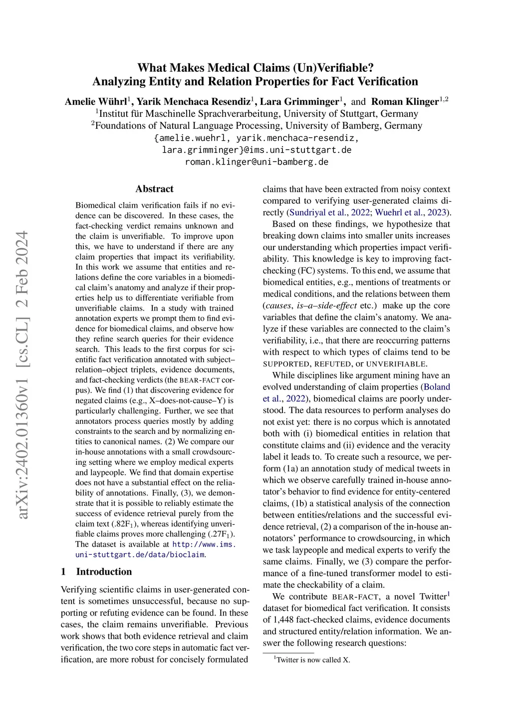 Biomedical claim verification fails if no evidence can be discovered. In these cases, the fact-checking verdict remains unknown and the claim is unverifiable. To improve upon this, we have to understand if there are any claim properties that impact its verifiability. In this work we assume that entities and relations define the core variables in a biomedical claim's anatomy and analyze if their properties help us to differentiate verifiable from unverifiable claims. In a study with trained annotation experts we prompt them to find evidence for biomedical claims, and observe how they refine search queries for their evidence search. This leads to the first corpus for scientific fact verification annotated with subject-relation-object triplets, evidence documents, and fact-checking verdicts (the BEAR-Fact corpus). We find (1) that discovering evidence for negated claims (e.g., X-does-not-cause-Y) is particularly challenging. Further, we see that annotators process queries mostly by adding constraints to the search and by normalizing entities to canonical names. (2) We compare our in-house annotations with a small crowdsourcing setting where we employ medical experts and laypeople. We find that domain expertise does not have a substantial effect on the reliability of annotations. Finally, (3), we demonstrate that it is possible to reliably estimate the success of evidence retrieval purely from the claim text~(.82\F), whereas identifying unverifiable claims proves more challenging (.27\F). The dataset is available at http://www.ims.uni-stuttgart.de/data/bioclaim.