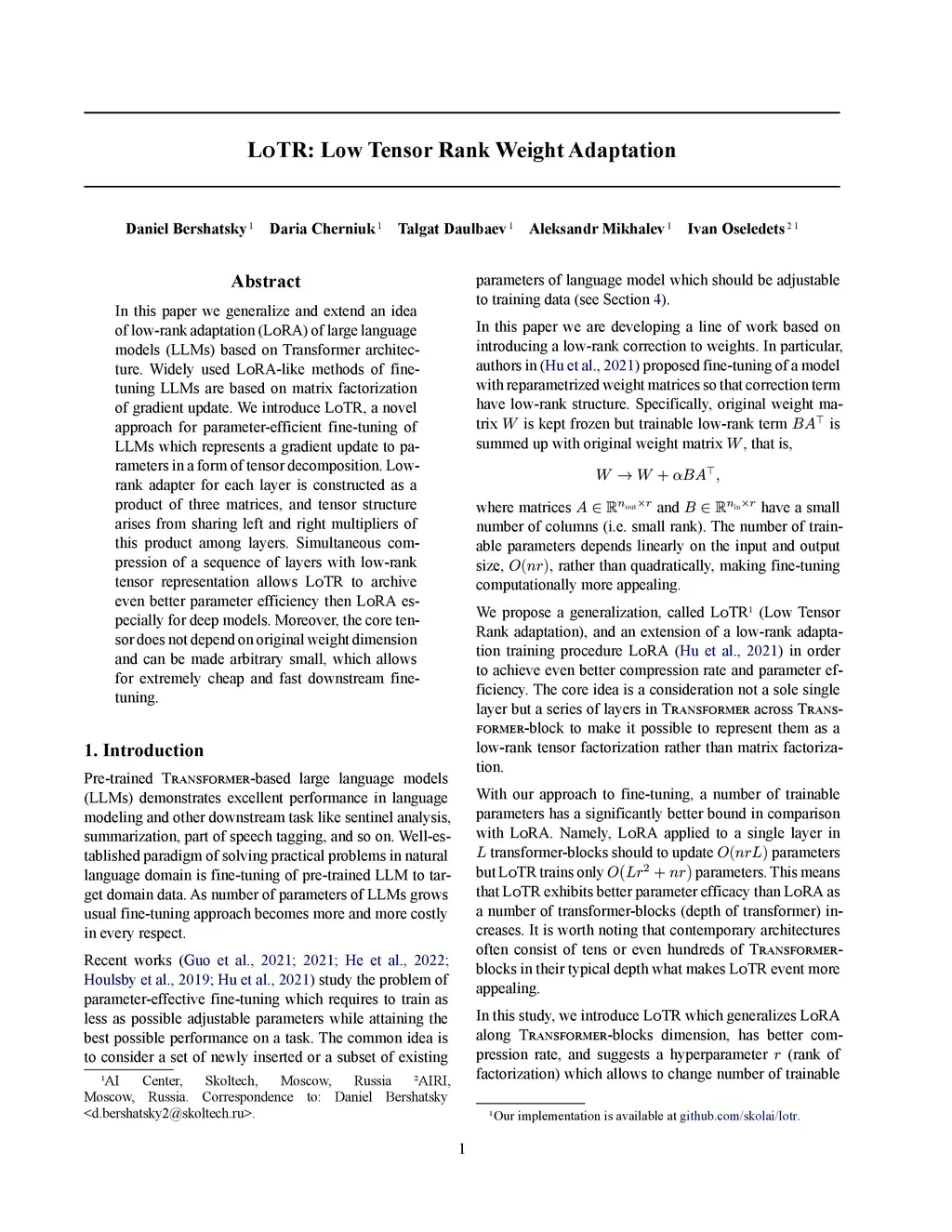 LoTR: Low Tensor Rank Weight Adaptation