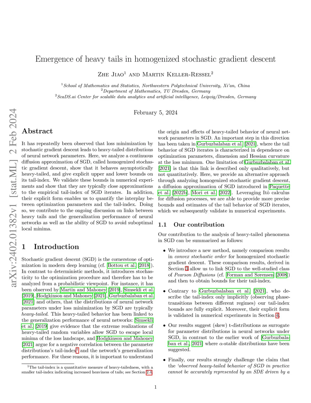 It has repeatedly been observed that loss minimization by stochastic gradient descent (SGD) leads to heavy-tailed distributions of neural network parameters. Here, we analyze a continuous diffusion approximation of SGD, called homogenized stochastic gradient descent, show that it behaves asymptotically heavy-tailed, and give explicit upper and lower bounds on its tail-index. We validate these bounds in numerical experiments and show that they are typically close approximations to the empirical tail-index of SGD iterates. In addition, their explicit form enables us to quantify the interplay between optimization parameters and the tail-index. Doing so, we contribute to the ongoing discussion on links between heavy tails and the generalization performance of neural networks as well as the ability of SGD to avoid suboptimal local minima.
