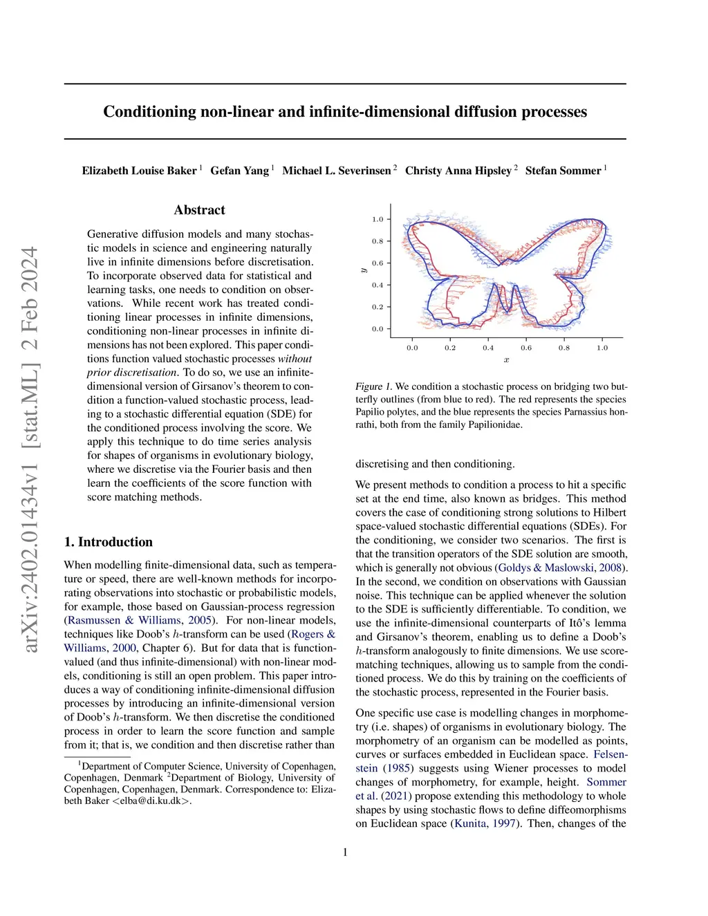 Generative diffusion models and many stochastic models in science and engineering naturally live in infinite dimensions before discretisation. To incorporate observed data for statistical and learning tasks, one needs to condition on observations. While recent work has treated conditioning linear processes in infinite dimensions, conditioning non-linear processes in infinite dimensions has not been explored. This paper conditions function valued stochastic processes without prior discretisation. To do so, we use an infinite-dimensional version of Girsanov's theorem to condition a function-valued stochastic process, leading to a stochastic differential equation (SDE) for the conditioned process involving the score. We apply this technique to do time series analysis for shapes of organisms in evolutionary biology, where we discretise via the Fourier basis and then learn the coefficients of the score function with score matching methods.