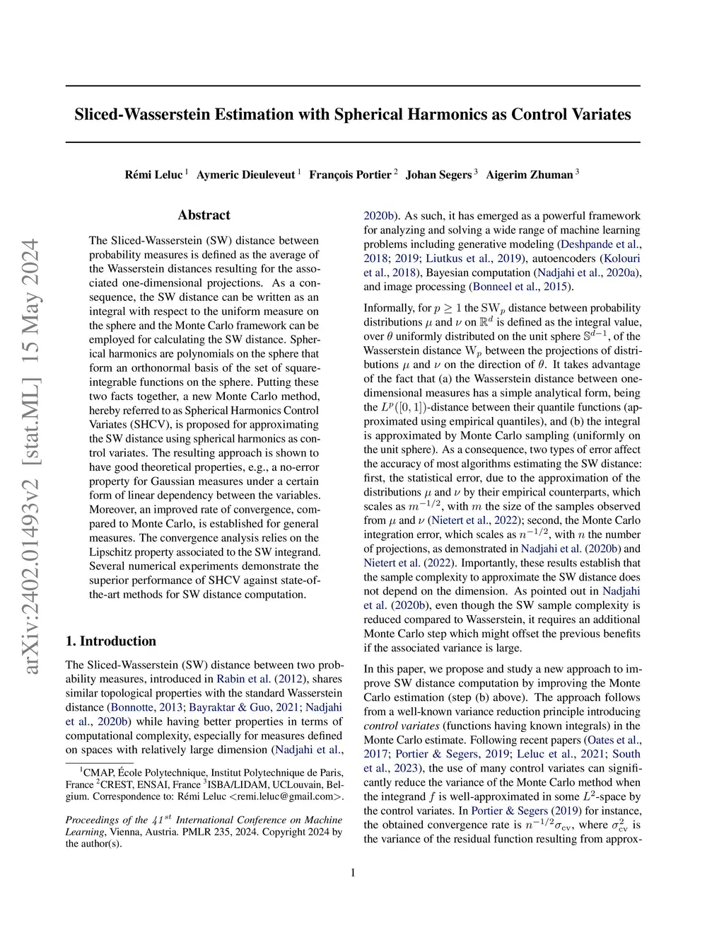 The Sliced-Wasserstein (SW) distance between probability measures is defined as the average of the Wasserstein distances resulting for the associated one-dimensional projections. As a consequence, the SW distance can be written as an integral with respect to the uniform measure on the sphere and the Monte Carlo framework can be employed for calculating the SW distance. Spherical harmonics are polynomials on the sphere that form an orthonormal basis of the set of square-integrable functions on the sphere. Putting these two facts together, a new Monte Carlo method, hereby referred to as Spherical Harmonics Control Variates (SHCV), is proposed for approximating the SW distance using spherical harmonics as control variates. The resulting approach is shown to have good theoretical properties, e.g., a no-error property for Gaussian measures under a certain form of linear dependency between the variables. Moreover, an improved rate of convergence, compared to Monte Carlo, is established for general measures. The convergence analysis relies on the Lipschitz property associated to the SW integrand. Several numerical experiments demonstrate the superior performance of SHCV against state-of-the-art methods for SW distance computation.