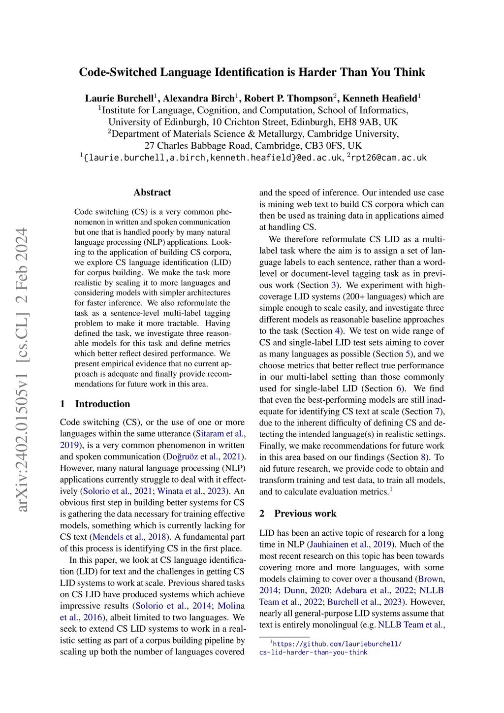 Code switching (CS) is a very common phenomenon in written and spoken communication but one that is handled poorly by many natural language processing applications. Looking to the application of building CS corpora, we explore CS language identification (LID) for corpus building. We make the task more realistic by scaling it to more languages and considering models with simpler architectures for faster inference. We also reformulate the task as a sentence-level multi-label tagging problem to make it more tractable. Having defined the task, we investigate three reasonable models for this task and define metrics which better reflect desired performance. We present empirical evidence that no current approach is adequate and finally provide recommendations for future work in this area.