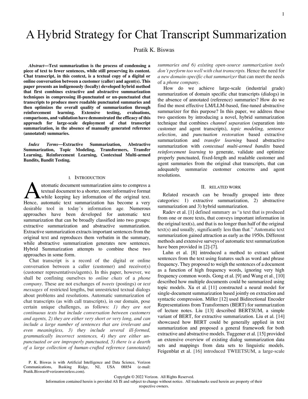 Text summarization is the process of condensing a piece of text to fewer sentences, while still preserving its content. Chat transcript, in this context, is a textual copy of a digital or online conversation between a customer (caller) and agent(s). This paper presents an indigenously (locally) developed hybrid method that first combines extractive and abstractive summarization techniques in compressing ill-punctuated or un-punctuated chat transcripts to produce more readable punctuated summaries and then optimizes the overall quality of summarization through reinforcement learning. Extensive testing, evaluations, comparisons, and validation have demonstrated the efficacy of this approach for large-scale deployment of chat transcript summarization, in the absence of manually generated reference (annotated) summaries.