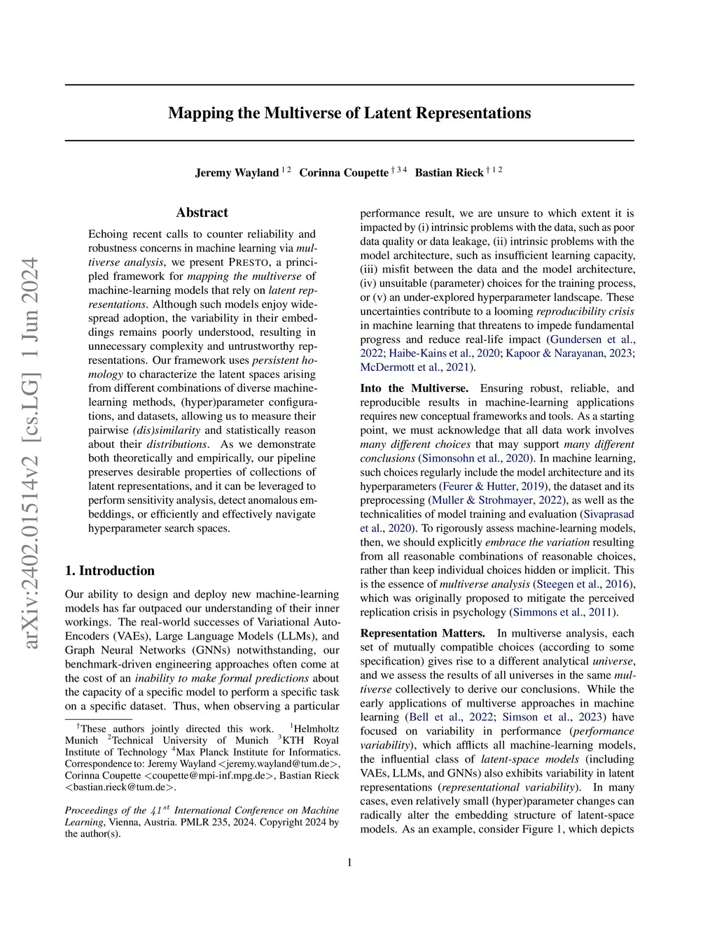 Echoing recent calls to counter reliability and robustness concerns in machine learning via multiverse analysis, we present PRESTO, a principled framework for mapping the multiverse of machine-learning models that rely on latent representations. Although such models enjoy widespread adoption, the variability in their embeddings remains poorly understood, resulting in unnecessary complexity and untrustworthy representations. Our framework uses persistent homology to characterize the latent spaces arising from different combinations of diverse machine-learning methods, (hyper)parameter configurations, and datasets, allowing us to measure their pairwise (dis)similarity and statistically reason about their distributions. As we demonstrate both theoretically and empirically, our pipeline preserves desirable properties of collections of latent representations, and it can be leveraged to perform sensitivity analysis, detect anomalous embeddings, or efficiently and effectively navigate hyperparameter search spaces.