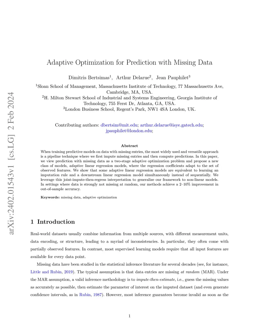 When training predictive models on data with missing entries, the most widely used and versatile approach is a pipeline technique where we first impute missing entries and then compute predictions. In this paper, we view prediction with missing data as a two-stage adaptive optimization problem and propose a new class of models, adaptive linear regression models, where the regression coefficients adapt to the set of observed features. We show that some adaptive linear regression models are equivalent to learning an imputation rule and a downstream linear regression model simultaneously instead of sequentially. We leverage this joint-impute-then-regress interpretation to generalize our framework to non-linear models. In settings where data is strongly not missing at random, our methods achieve a 2-10% improvement in out-of-sample accuracy.