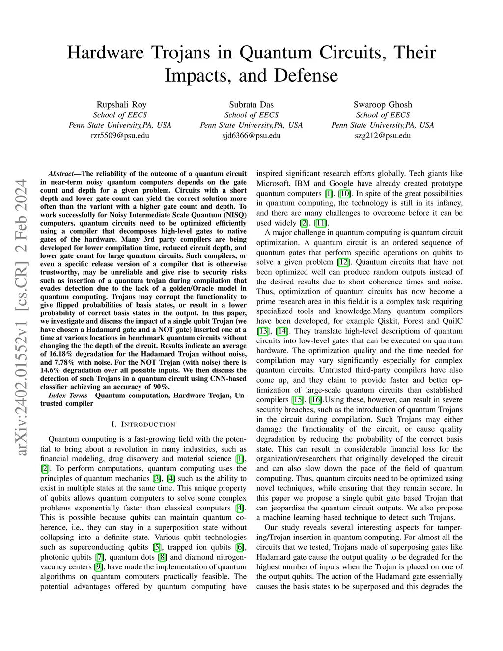 The reliability of the outcome of a quantum circuit in near-term noisy quantum computers depends on the gate count and depth for a given problem. Circuits with a short depth and lower gate count can yield the correct solution more often than the variant with a higher gate count and depth. To work successfully for Noisy Intermediate Scale Quantum (NISQ) computers, quantum circuits need to be optimized efficiently using a compiler that decomposes high-level gates to native gates of the hardware. Many 3rd party compilers are being developed for lower compilation time, reduced circuit depth, and lower gate count for large quantum circuits. Such compilers, or even a specific release version of a compiler that is otherwise trustworthy, may be unreliable and give rise to security risks such as insertion of a quantum trojan during compilation that evades detection due to the lack of a golden/Oracle model in quantum computing. Trojans may corrupt the functionality to give flipped probabilities of basis states, or result in a lower probability of correct basis states in the output. In this paper, we investigate and discuss the impact of a single qubit Trojan (we have chosen a Hadamard gate and a NOT gate) inserted one at a time at various locations in benchmark quantum circuits without changing the the depth of the circuit. Results indicate an average of 16.18% degradation for the Hadamard Trojan without noise, and 7.78% with noise. For the NOT Trojan (with noise) there is 14.6% degradation over all possible inputs. We then discuss the detection of such Trojans in a quantum circuit using CNN-based classifier achieving an accuracy of 90%.