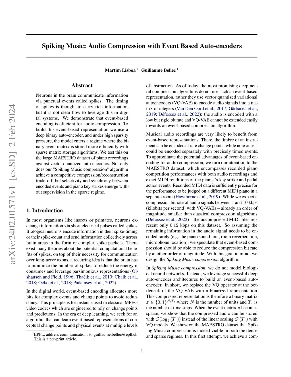 Neurons in the brain communicate information via punctual events called spikes. The timing of spikes is thought to carry rich information, but it is not clear how to leverage this in digital systems. We demonstrate that event-based encoding is efficient for audio compression. To build this event-based representation we use a deep binary auto-encoder, and under high sparsity pressure, the model enters a regime where the binary event matrix is stored more efficiently with sparse matrix storage algorithms. We test this on the large MAESTRO dataset of piano recordings against vector quantized auto-encoders. Not only does our "Spiking Music compression" algorithm achieve a competitive compression/reconstruction trade-off, but selectivity and synchrony between encoded events and piano key strikes emerge without supervision in the sparse regime.