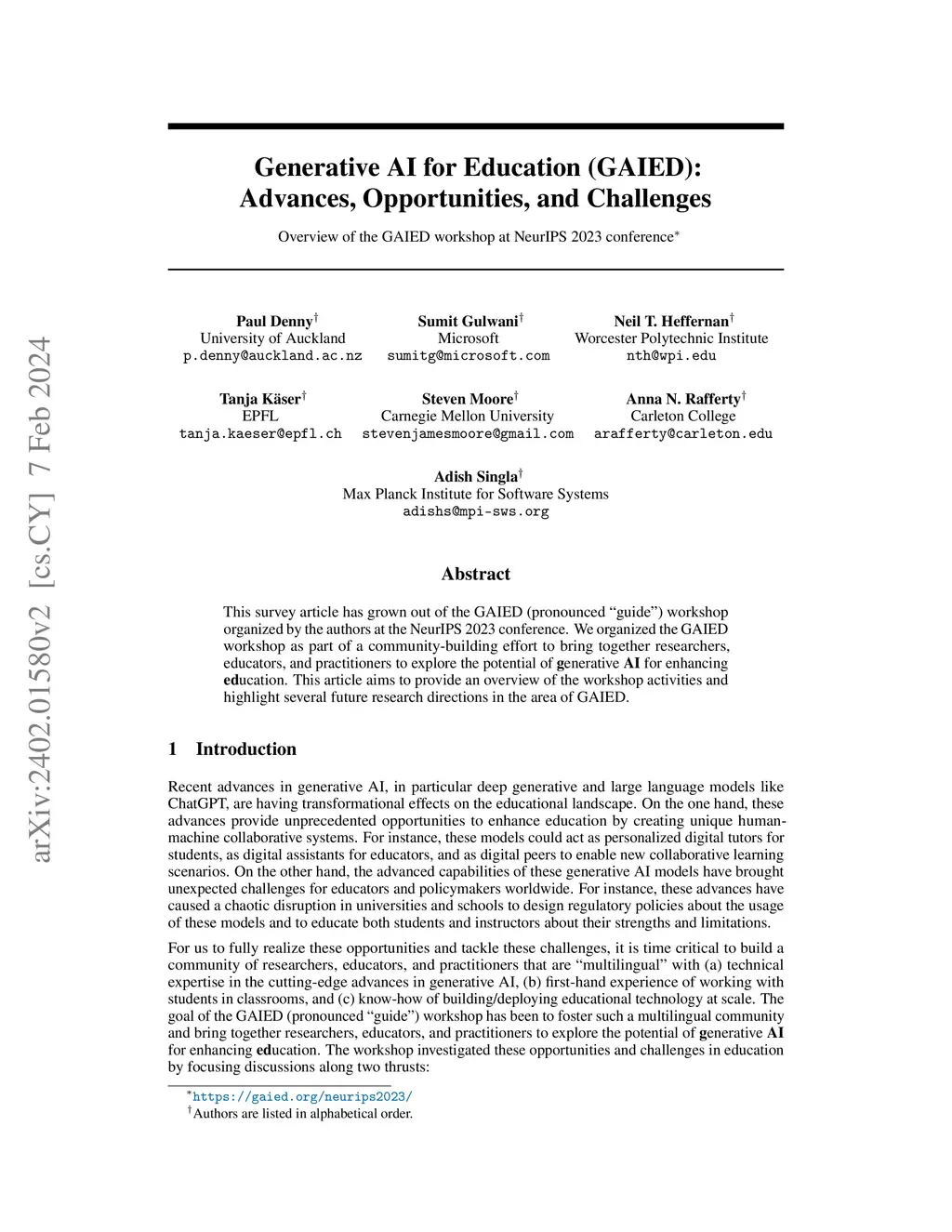 This survey article has grown out of the GAIED (pronounced "guide") workshop organized by the authors at the NeurIPS 2023 conference. We organized the GAIED workshop as part of a community-building effort to bring together researchers, educators, and practitioners to explore the potential of generative AI for enhancing education. This article aims to provide an overview of the workshop activities and highlight several future research directions in the area of GAIED.