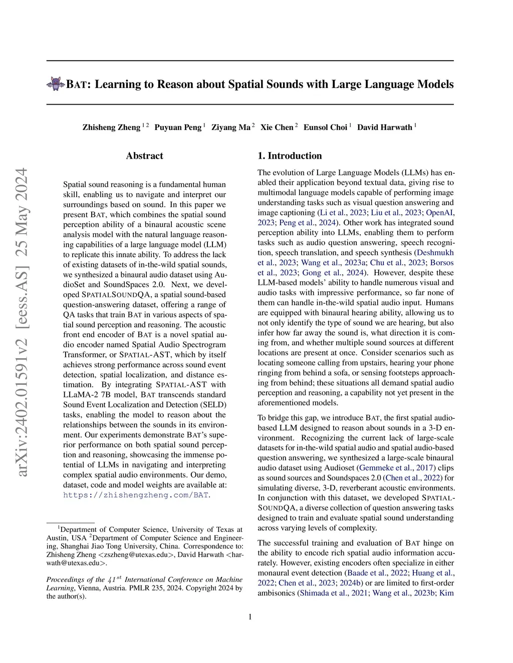 Spatial sound reasoning is a fundamental human skill, enabling us to navigate and interpret our surroundings based on sound. In this paper we present BAT, which combines the spatial sound perception ability of a binaural acoustic scene analysis model with the natural language reasoning capabilities of a large language model (LLM) to replicate this innate ability. To address the lack of existing datasets of in-the-wild spatial sounds, we synthesized a binaural audio dataset using AudioSet and SoundSpaces 2.0. Next, we developed SpatialSoundQA, a spatial sound-based question-answering dataset, offering a range of QA tasks that train BAT in various aspects of spatial sound perception and reasoning. The acoustic front end encoder of BAT is a novel spatial audio encoder named Spatial Audio Spectrogram Transformer, or Spatial-AST, which by itself achieves strong performance across sound event detection, spatial localization, and distance estimation. By integrating Spatial-AST with LLaMA-2 7B model, BAT transcends standard Sound Event Localization and Detection (SELD) tasks, enabling the model to reason about the relationships between the sounds in its environment. Our experiments demonstrate BAT's superior performance on both spatial sound perception and reasoning, showcasing the immense potential of LLMs in navigating and interpreting complex spatial audio environments.