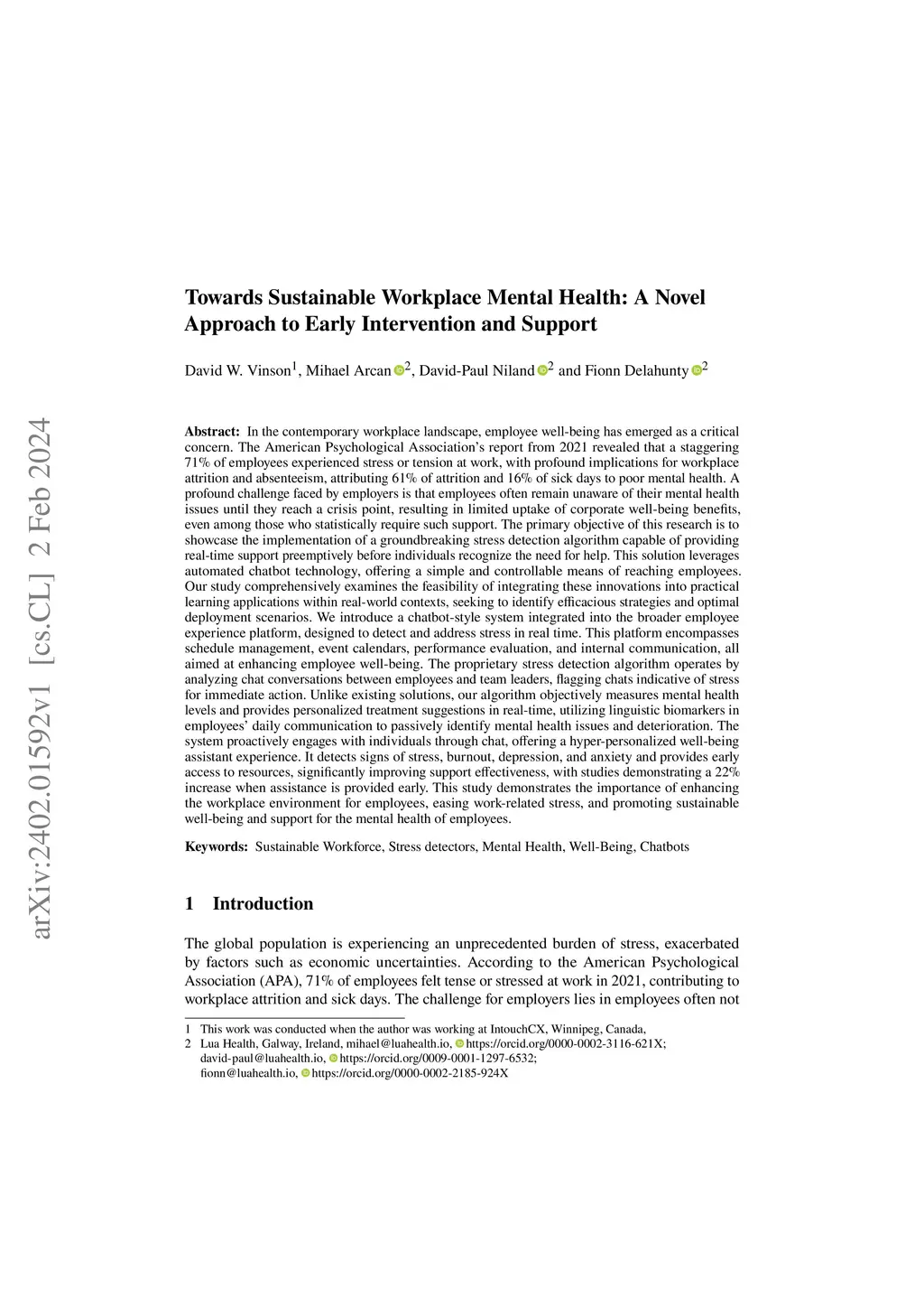 Employee well-being is a critical concern in the contemporary workplace, as highlighted by the American Psychological Association's 2021 report, indicating that 71% of employees experience stress or tension. This stress contributes significantly to workplace attrition and absenteeism, with 61% of attrition and 16% of sick days attributed to poor mental health. A major challenge for employers is that employees often remain unaware of their mental health issues until they reach a crisis point, resulting in limited utilization of corporate well-being benefits. This research addresses this challenge by presenting a groundbreaking stress detection algorithm that provides real-time support preemptively. Leveraging automated chatbot technology, the algorithm objectively measures mental health levels by analyzing chat conversations, offering personalized treatment suggestions in real-time based on linguistic biomarkers. The study explores the feasibility of integrating these innovations into practical learning applications within real-world contexts and introduces a chatbot-style system integrated into the broader employee experience platform. This platform, encompassing various features, aims to enhance overall employee well-being, detect stress in real time, and proactively engage with individuals to improve support effectiveness, demonstrating a 22% increase when assistance is provided early. Overall, the study emphasizes the importance of fostering a supportive workplace environment for employees' mental health.