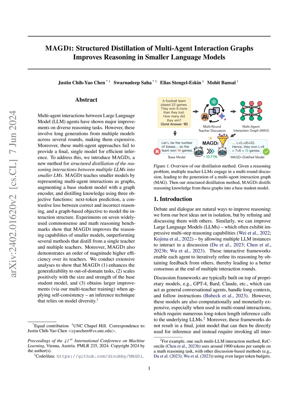 Multi-agent interactions between Large Language Model (LLM) agents have shown major improvements on diverse reasoning tasks. However, these involve long generations from multiple models across several rounds, making them expensive. Moreover, these multi-agent approaches fail to provide a final, single model for efficient inference. To address this, we introduce MAGDi, a new method for structured distillation of the reasoning interactions between multiple LLMs into smaller LMs. MAGDi teaches smaller models by representing multi-agent interactions as graphs, augmenting a base student model with a graph encoder, and distilling knowledge using three objective functions: next-token prediction, a contrastive loss between correct and incorrect reasoning, and a graph-based objective to model the interaction structure. Experiments on seven widely used commonsense and math reasoning benchmarks show that MAGDi improves the reasoning capabilities of smaller models, outperforming several methods that distill from a single teacher and multiple teachers. Moreover, MAGDi also demonstrates an order of magnitude higher efficiency over its teachers. We conduct extensive analyses to show that MAGDi (1) enhances the generalizability to out-of-domain tasks, (2) scales positively with the size and strength of the base student model, and (3) obtains larger improvements (via our multi-teacher training) when applying self-consistency -- an inference technique that relies on model diversity.